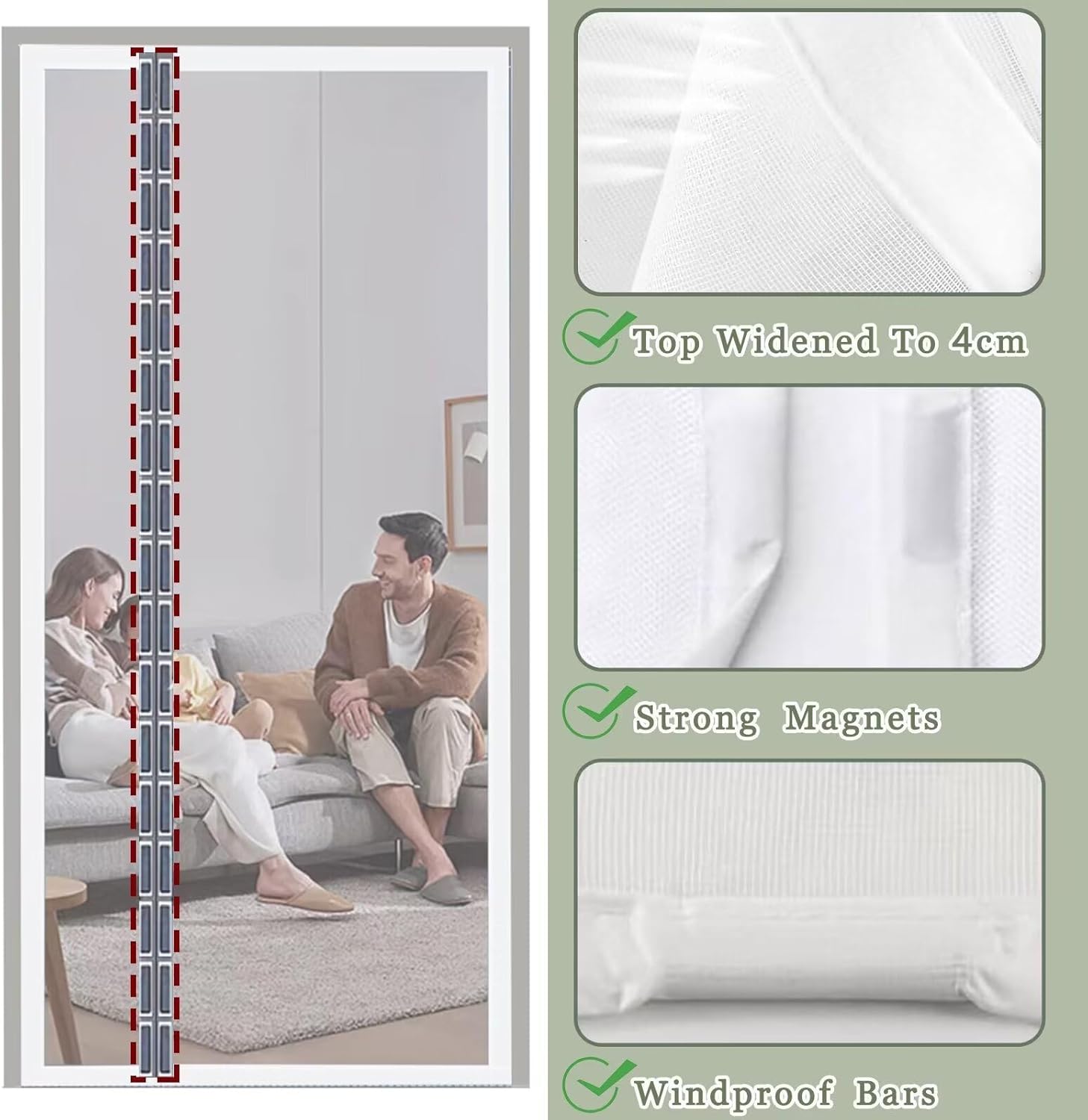 Fly Screen Door Balcony Door Insect Proof Magnetic Curtain Magnetic Curtain Automatic Closing Magnetic Adsorption Door/Patio Magnetic fly screen reliably protects you and your family from insects. Durable mosquito net with micro holes keeps bugs out and lets fresh air in. Hemmed edges, no pinching, for years of use. The soft material is easy to clean and machine washable. How to choose the right size? Please note: curtains cannot be shortened. Please measure the door size before ordering. Measure the inner door frame (inner door width x inner door height). Increase the width of the inner door by 4-8 cm and the height of the inner door by 2-4 cm to determine the suitable size for the screen door. Choose a magnetic mosquito net with the closest size, preferably one that is wide and high (but not smaller than a door). Instructions for use: First clean the window until the cleaned window is completely dry. Attach the included fasteners to the fly screen without removing the straps. Peel off the top backing tape, stick the curtain to the window first, and then press it firmly.