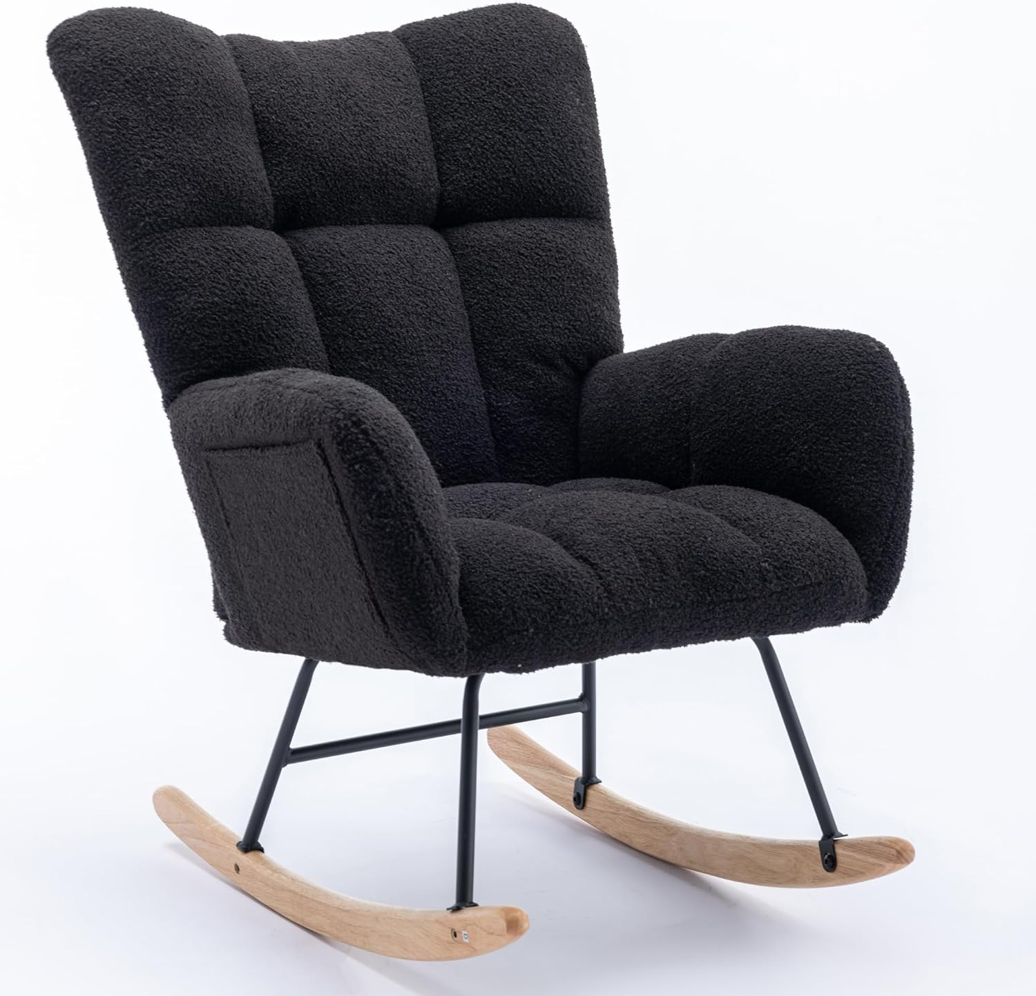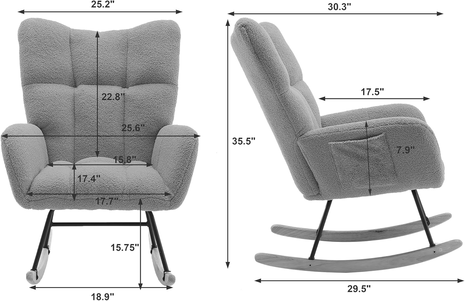 Product InformationProduct Name:Rocking Chair with Pocket, Soft Teddy Fabric Rocking Chair for Nursery, Comfy Wingback Glider Rocker with Safe Solid Wood Base for Living Room Bedroom Balcony (black)Place of Origin:ChinaMain Color:BlackFiller:FoamProduct Style:CasualMain Material:TeddyWeight Capacity:250 LBSFabric material:Teddy fleeceProduct DimensionsAssembled Length (in.):30.30Assembled Width (in.):25.20Assembled Height (in.):35.50Weight (lbs.):25.30Package SizeLength (in.):25.60Width (in.):25.60Height (in.):12.80Weight (lbs.):28.60