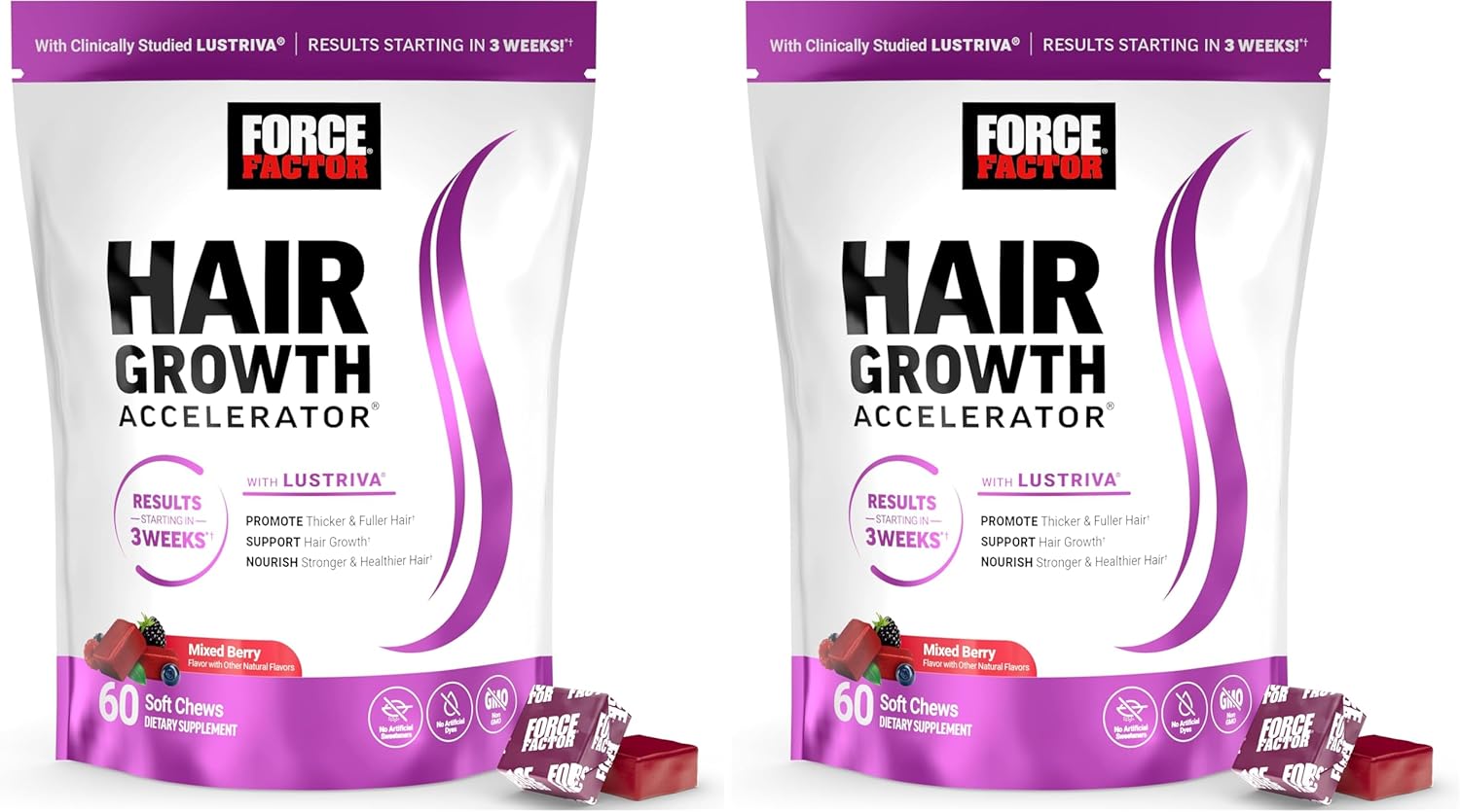 Support your beauty and wellness from the inside out with Force Factor Hair Growth Accelerator. This comprehensive hair growth multivitamin formula delivers essential vitamins—A, B12, C, D, and E—plus collagen, biotin, and key superfoods to promote fuller hair, healthier nails, and more radiant skin. Fortified with clinically studied Lustriva, a superior biotin and silicon complex that’s 40X more soluble than standard biotin, this advanced blend has been shown to increase hair thickness starting in as little as 3 weeks.* It also supports all 4 stages of hair growth—development, transition, rest, and shedding—with targeted nutrients like collagen, saw palmetto, and horsetail. This powerful daily multivitamin also helps reduce the appearance of fine lines and wrinkles, for healthier skin and a smoother complextion. Made in the USA in GMP-compliant facilities, every ingredient is rigorously tested for purity and potency to ensure the highest quality. *In a clinical study by Kalman et al. (2021), results showed a significant increase in hair thickness in the Lustriva® group, a key ingredient in Hair Growth Accelerator, compared to the placebo at Week 3. These statements have not been evaluated by the Food and Drug Administration. This product is not intended to diagnose, treat, cure, or prevent any disease.