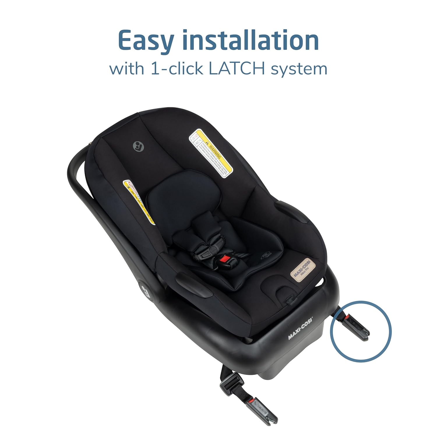 The lightweight Maxi-Cosi Mico Pro Infant Car Seat is designed for comfort and convenience and allows you to travel with ease. The 1-hand release makes it easy to move from car to car or to a compatible stroller without a struggle. Our infant car seat carrier is designed with a contoured, ergonomic handle, so parents will enjoy a more comfortable carrying experience. The Mico Pro is simple and intuitive to install and achieve a secure fit in your car with its 5-point harness, 3-position adjustable base, and 1-click LATCH system. Large, visible belt guides indicate how to position the belt without using the base (taxi mode). We factor your baby’s comfort as key. The infant car seat carrier shell is designed with ClimaFlow technology for added ventilation to help keep your baby cooler. Extra plush padding on the removable infant head and lumbar inserts provides a secure and cozy ride. Key to the design of this infant car seat are the premium fabrics. PureCosi fabric is made without added fire retardant treatments, which is better for both your child and our planet. All infant car seat cushions are machine-washable and dryer-safe. Mico Pro is also designed with EcoCare, our future-friendly, 100% recycled fabric made from plastic bottles. The yarn produced is soft, comfortable, and breathable—perfect for your little one. Fits babies 4–30 lbs. and up to 32". Actual fit may vary. Not all children will comfortably fit in the seat for the full weight and height ranges listed.