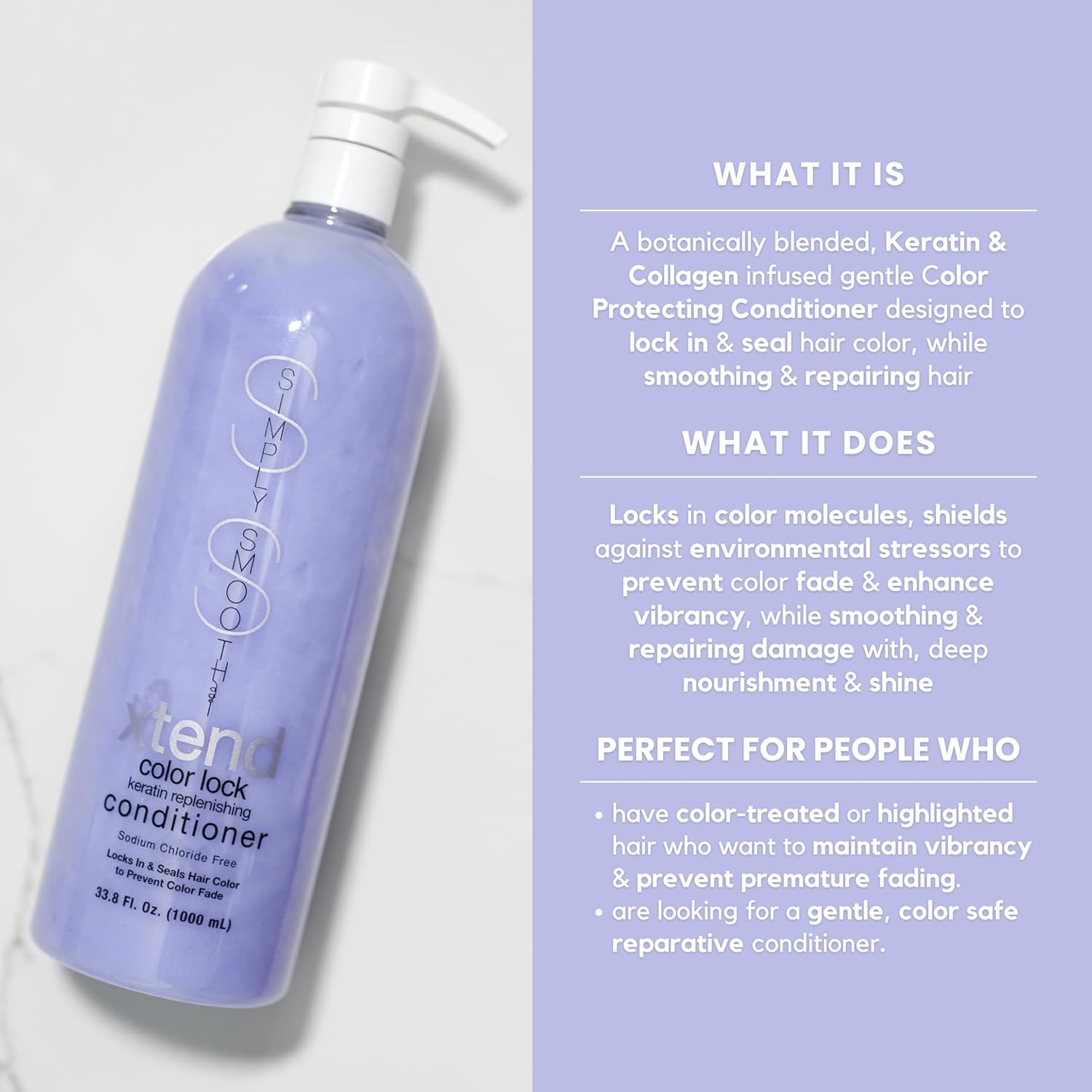Simply Smooth xtend color lock keratin replenishing conitioner will detangle, reduce frizz, enhance luster, add luxurious shine, tame fly-aways, promote volume and leave hair illuminated, smooth and silky while providing long lasting vibrant color results. Hair will be restored, protected, and prevented from further damage while having the added benefit of locked in hair color. Developed with high quality keratin and botanicals, xtend color lock keratin replenishing conditioner restores depleted keratin into hair fibers. This keratin replenishment will repair damaged hair, increase tensile strength and elasticity and protect hair from future damage. Overall texture and quality of hair will be improved with continued use. Xtend color lock keratin replenishing shampoo, with its delicious fragrance, is safe on all hair types and is formulated to benefit whether or not a Simply Smooth treatment has been applied. When used after a Simply Smooth treatment, it will prolong and maintain the treatment. Sodium chloride-free. Locks in hair color services. Hydrates, repairs, strengthens and restores elasticity. Reduces frizz, seals split ends and smoothes. Leaves hair illuminating with a soft, silky, velvety light feel.