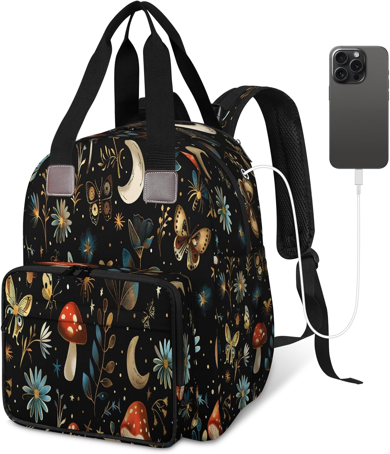 Product Includes:1 x Mommy Bag.Product size: 11.8x7.87x16.73 inches.Multi-functional : 1 main capacity pocket, the backpack is also equipped with a USB charging port and data cable, convenient for you to charge your phone (mobile power is not included), 2 side pockets in total can be put water cups, umbrellas, the other side pockets have an opening on one side of the pocket design, can be placed on the paper towels, easy to extract, 2 front zipper pockets, pockets with small compartments with thermal insulation, can be placed on the baby to drink the milk, behind a zipper pockets, the inside of the 6 small Organizer compartment, multi-pocket design, easy to put and take.Empty bag can stand, handheld shoulder can be. Adopt double zipper design, comfortable hand feeling. Adjustable shoulder strap, DIY customized print design, large capacity, durable and fashionable.Whether it's for yourself, your friends, your wife or your family, the multi-functional mommy bag is very practical and thoughtful!Care: Hand wash, hang dry, low temperature ironing, do not rinse, can not wring (can be partially squeezed) is recommended.