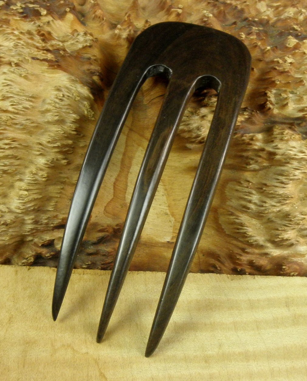 S.E. Asian Ebony is a true member of the Diospyros (Ebony) family know for its beautiful color range and superior strength. About 5 inches long and 1 7/8 inch wide with three prongs running the entire length gives special holding power. Curved nature keeps Hair Fork next to the shape of the head. Functional Prong Length (FPL) is 4".