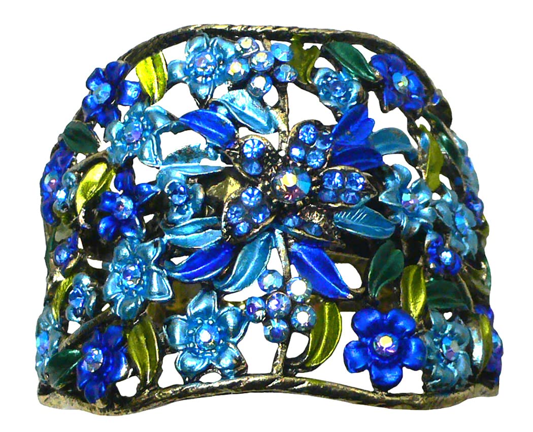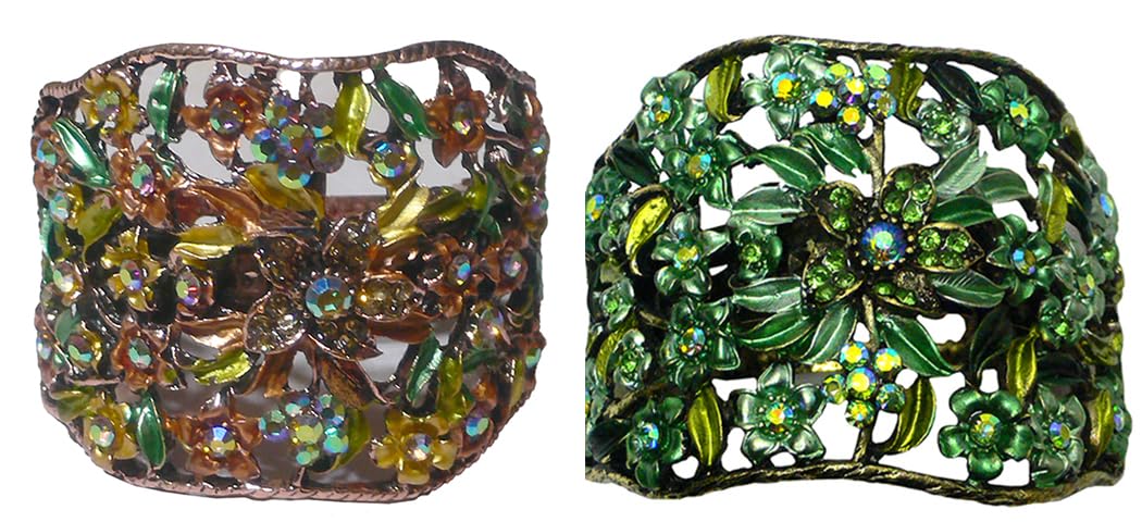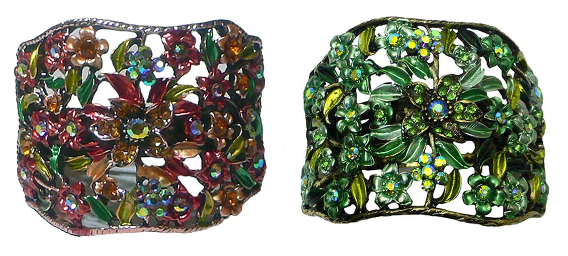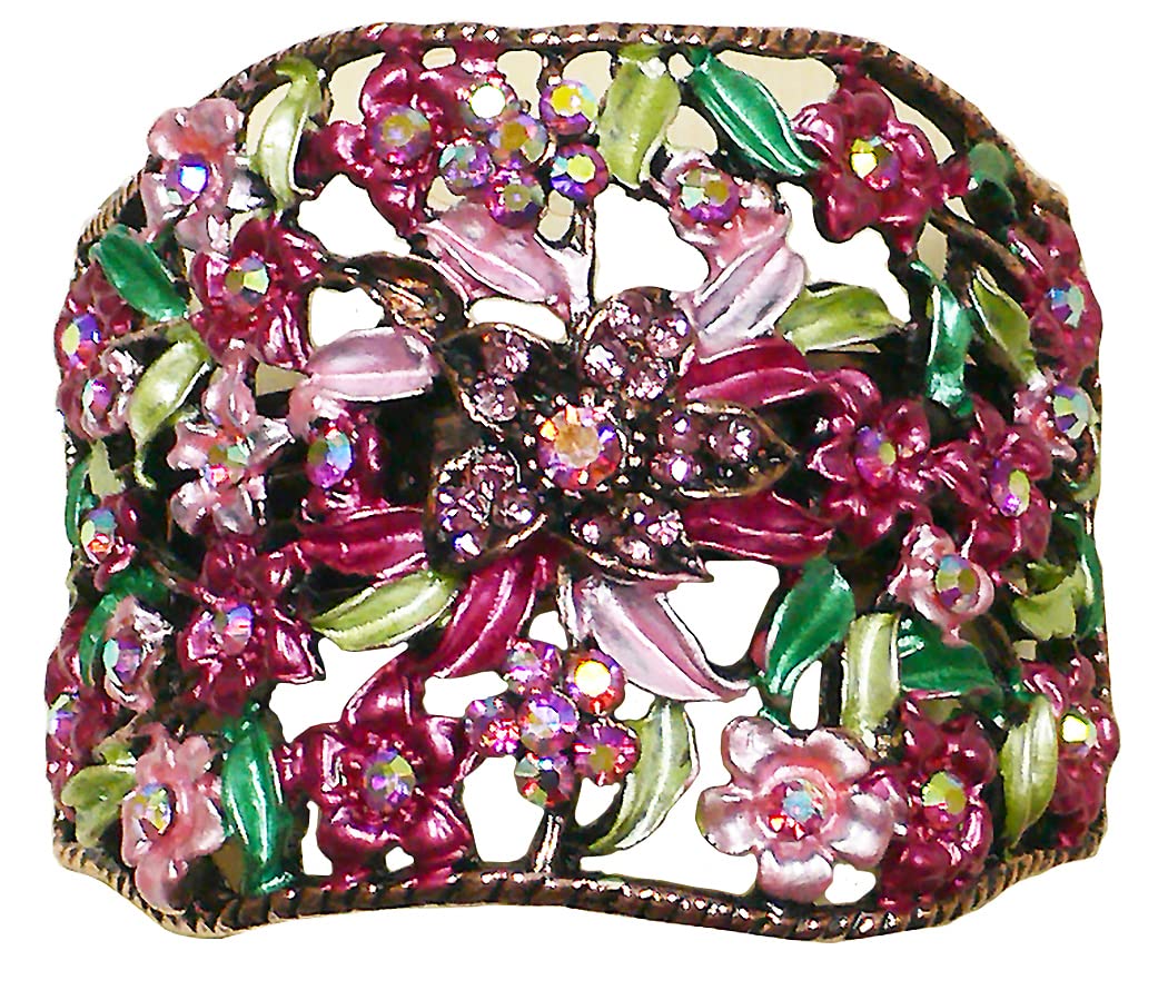 Set of 3 hair holder barrettes, design of flowers and leaves, artistic hand painting, sparkly crystals. Hair holder barrette in half moon shape measuring 2.5" x 2" provides ample cavity to hold medium to thick hair for high or low ponytail. For thin hair, wear a fabric wrapped elastic band underneath will help.