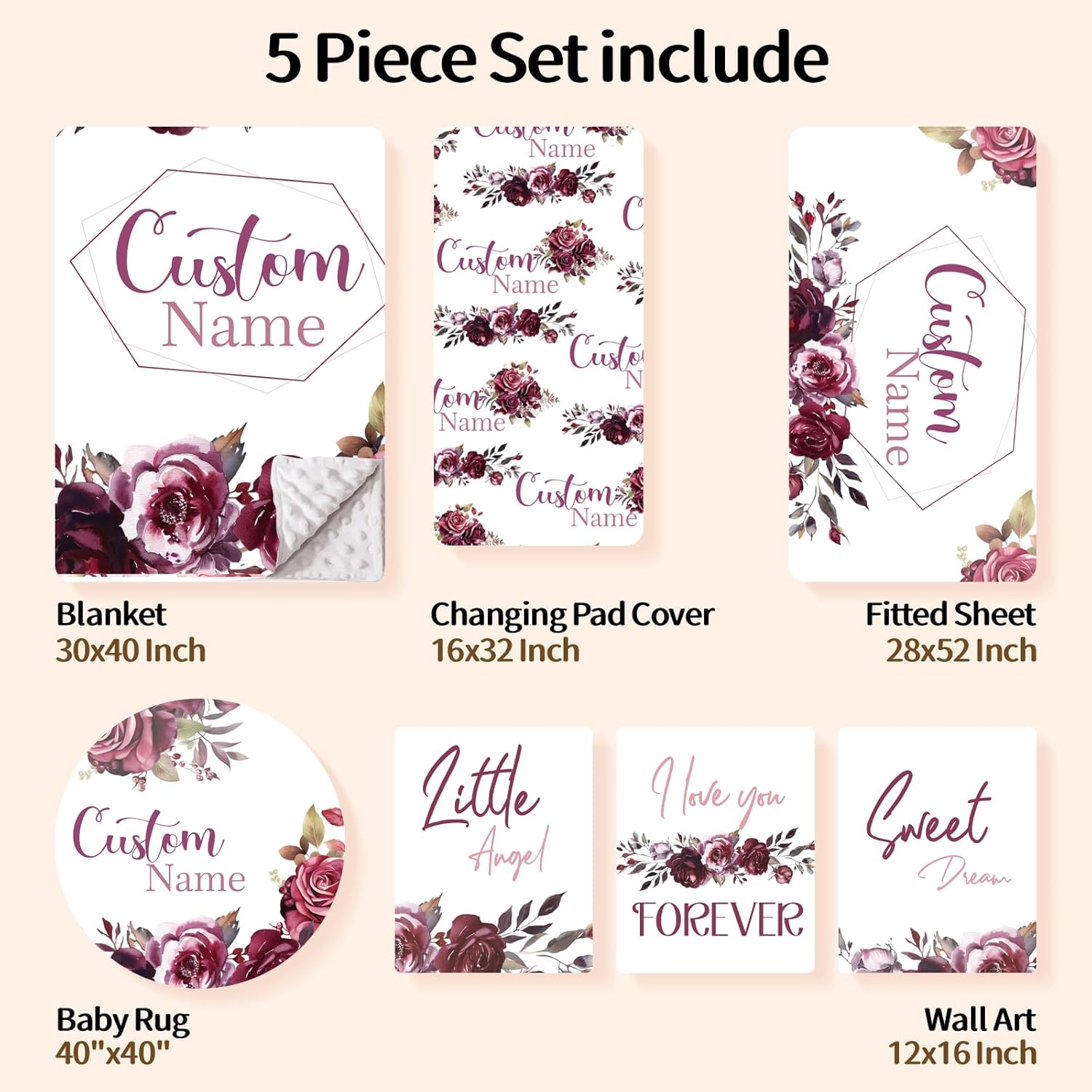 Create a warm and personalized nursery space with this custom baby crib bedding set, designed to add a meaningful name detail to your childs room. Featuring a coordinated multi-piece design, this set brings visual harmony while adding a personal touch that parents love to keep as a lasting memory.The complete nursery bedding set includes a soft double-layer dotted blanket, fitted crib sheet, changing pad cover, baby rug, and matching wall art. Each piece is carefully designed to work together, helping you build a cozy and well-decorated nursery with ease.Made from soft, breathable, and baby-friendly fabrics, this personalized crib bedding set offers gentle comfort for everyday use. The smooth texture is suitable for delicate skin, making it ideal for naps, bedtime routines, and quiet moments in the nursery.Designed for convenience, all pieces are machine washable and easy to maintain. The fabric keeps its softness and appearance after repeated washes, supporting a clean and comfortable nursery environment for busy families.This personalized nursery bedding set also makes a thoughtful gift for baby showers, newborn celebrations, or first birthdays. With its custom name detail and practical design, its a meaningful addition to any baby boy or girls nursery dcor.