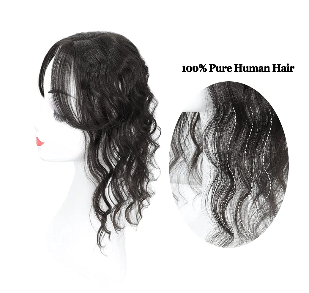Specification: Type:Clip-in hair topper with bangs Base size:5x5"/13x13cm U-part silk base,with 4 pressure sensitive clips for a secure attachment Material:the best quality 100% real human hair Hair Texture:Wavy Hair with long wave side bangs. Hair Length:10"/25cm,12"/30,14"/35cm Color:Natural Black,Dark Brown,can be dyed into other colors at will. Natural looking:Blends in well with your hair,provide a natural hairline and fringe. How to wear? 1.First open all of the pressure sensitive clips hold both ends of the clip and press in the center to open.. 2.Secure front clip 1-2 inches behind front hair-line apply light pressure as you smooth base back,secure back clips. 3.Secure both side clips,keeping base taught and falt to head. 4.Style and blend hair as desired. 5.Your top will stay securely in place all day long How to tell human hair with synthetic hair? A:It is easy to tell by burning and smell:When burning,the human hair will show white smoke. While synthetic hair will be a sticky ball after burning and will show black smoke. Care Tips: 1.Wash in cool or warm water,use mild shampoo and brush the hair gently 2.In order to keep the hair silky and smooth,use some conditioner if necessary. 3.Let it dry natural blackly instead of using blow dryer. 5.When using styling tool,temperature is better lower for a short time Breathable Comfortable Realistic If you are bothered by thinning hair,gray hair,receding hairline,white hair or poor hair quality on top of head,this product is super suitable for you.It blends perfectly into your natural black hair.The base is breathable,Be a pretty and confident girl!