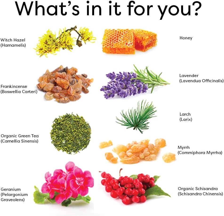 • What’s in it for you. The formula is a blend of water, organic matcha green tea, Schisandra powder, witch hazel, larch, and local honey accented by a carefully selected blend of these four essential oils: Lavender, Frankincense, Myrrh, and Geranium.