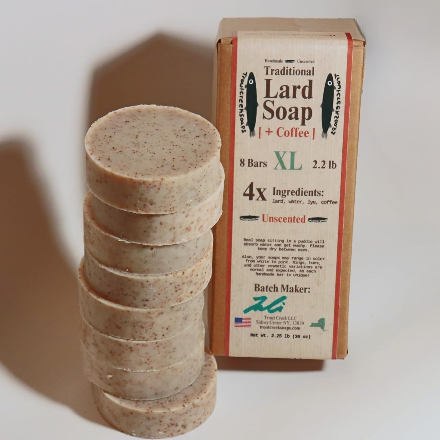 Our soap is mandmade in small batches using a traditional cold‑process technique. By eliminating middlemen, we drive high-quality control low prices. Each box is signed by the soapmaker. We make the soap using only 4 ingredients: lard, water, lye, coffee. It is unscented.