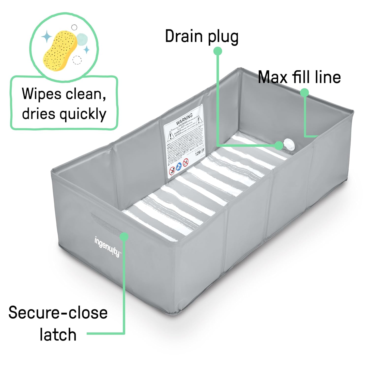 Any shower can become a bathtub with the Ingenuity Tuckaway Travel Tub. Just unfold the waterproof lining, fill with water, and give your kiddo a safe, comfy spot to splash—at home, at grandma’s, or on vacation. Spacious enough for babies 12 months to kids up to 5 years, it folds nearly flat for easy storage and travel. A max fill line helps you keep water levels safe, while the quick-release drain plug makes emptying simple. The waterproof lining wipes clean and dries fast, so your shower is back to normal in moments. From cozy nighttime baths to on-the-go cleanups, the Ingenuity® Tuckaway™ is the travel bath tub for baby that grows with your child—and fits your lifestyle. When fully open, the full size baby bathtub is 30" L x 15.5" W x 8.5" H. When folded, it's almost completely flat! With a max fill line to keep an eye on water levels and a drain plug for quick release, it's easy to keep baby safe as you help them enjoy bath time. The baby tub's waterproof lining is easy to clean and dries quickly, so you can return your shower to normal just moments later. Give your little one a spacious toddler tub all their own