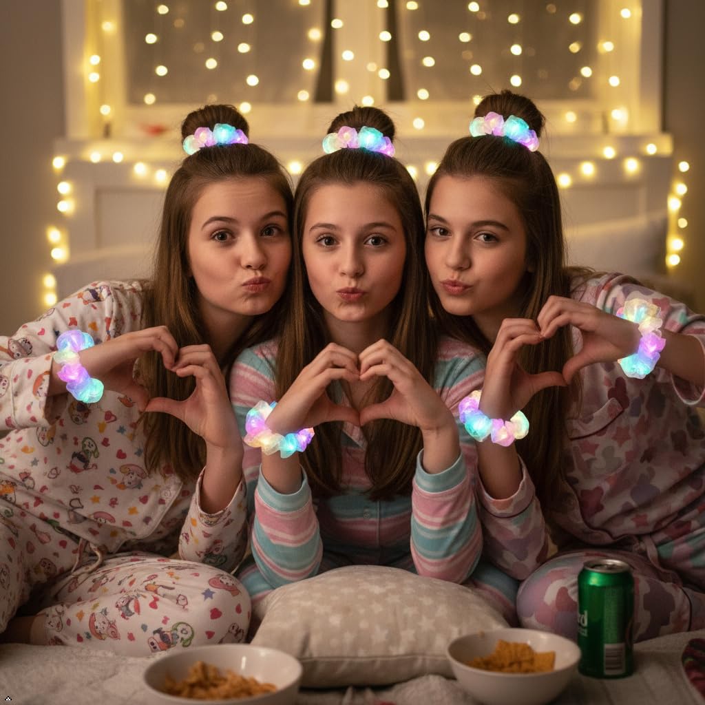 • 3 Light Modes Glow Scrunchies: This scrunchy for girls built-in led lights with three light modes, is a great and stunning birthday gift, is also a glow in the party supplies, neon party favor,sleepover party, Halloween Christmas party, camping,concert and even night running can be used, will not let you down!