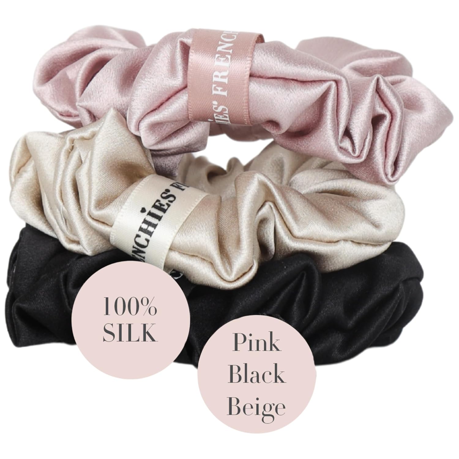 Frenchies Better Scrunchies, 100% Silk Super Grip No Slip Hair Tie with Smooth Low-Friction Hold for Fine to Medium Hair, Buns, Ponytails, Braids & Updos, 3 pack, Pink/Beige/Black, Skinny