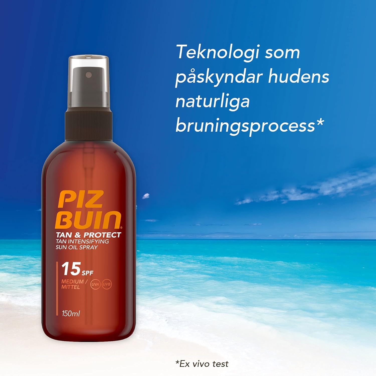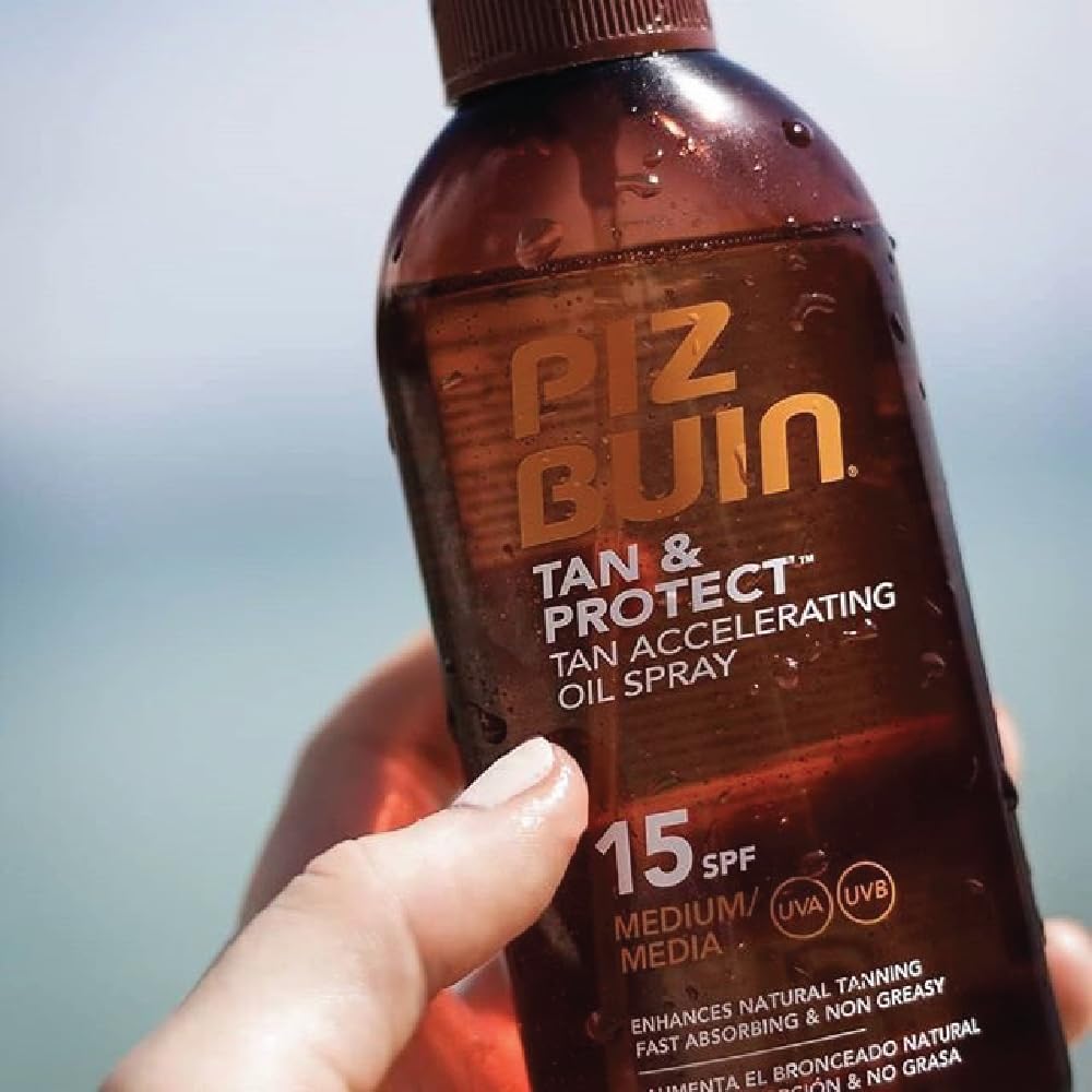 The Piz Buin Tan & Protect Tan Accelerating Oil Spray strengthens the natural tanning and is sweat and waterproof. The oil is absorbed quickly and leaves no sticky skin feeling. It combines effective UVA and UVB filters with illumitones that strengthen the skin's natural tanning process*. The spray should be applied generously before sunbathing. Especially after sweating, swimming or drying, the application should be repeated to improve sun protection. *Ex-vivo