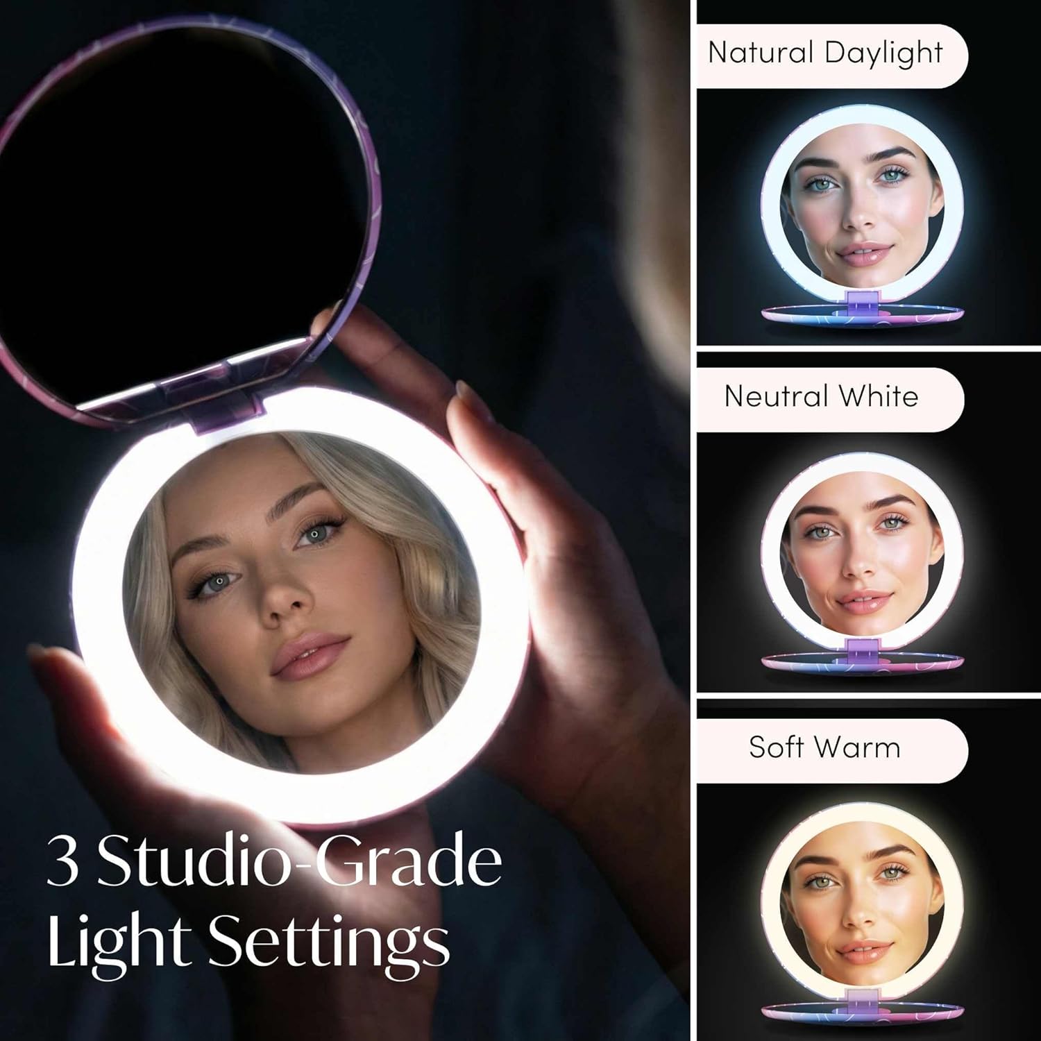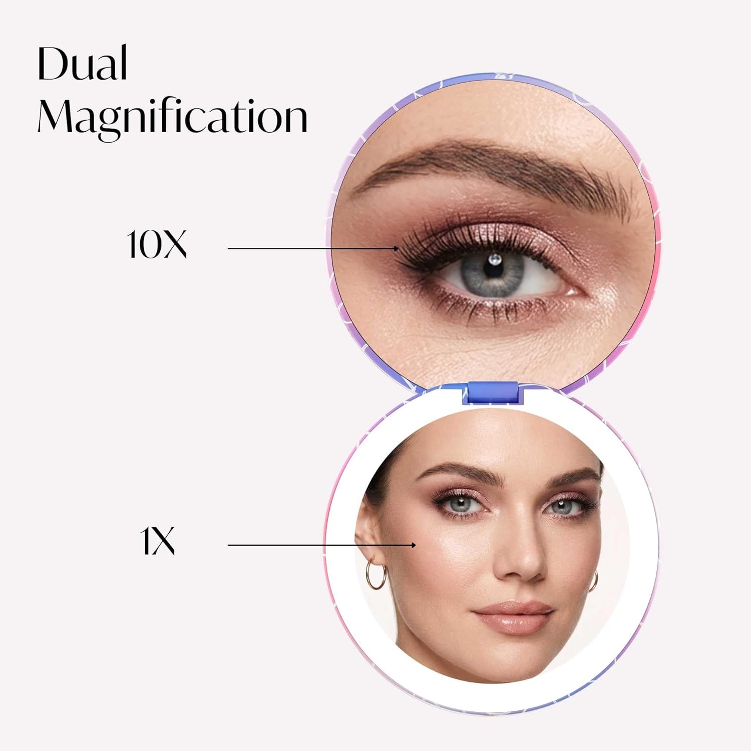 The Perfect Travel Mirror This sleek, modern mirror is small enough to take anywhere, yet powerful enough to allow makeup application without eyeglasses. Inside you'll find a folding two-panel magnifying mirror, clear from edge-to-edge with no distortion. Our 2-sided portable magnifying mirror comes with 1X and 10X magnification. The Right Light for Any Occasion Choose from three different LED color temperatures: soft white (3,500K), neutral white (5,000K) and natural daylight (6,000K). Each light setting can be further customized by the smart touch dimmable feature. Easily dim or brighten each light setting with a simple touch to help you achieve the exact amount of lighting to suit your preference. Large Distortion-Free Mirror The 5-inch wide high quality glass mirror offers an ultra-clear color-correct view, providing you with superior reflectivity and clarity. Beautiful Anywhere, Anytime The perfect companion for any woman. Elegant, stylish, and perfectly sized to fit in your handbag or purse, making this the ideal compact mirror for home or travel use. Accentuate the PositiveThis LED lighted compact mirror has the right magnification for any task, from tweezing to makeup application to contact lens insertion. It fits perfectly in one hand but also stays open when resting on a table. - 1X normal view offers you a distortion-free image of your whole face. - 10X magnification is great for close up detail work such as applying eye makeup or tweezing Compact Mirror Dimensions- Body: 130mm (5.1") diameter, 25mm (1") thick - 1X Mirror: 88 mm (3.0") diameter - 10X Mirror: 127 mm (5.0") diameter Worry-Free WarrantyAt Fancii, we believe in our products. That's why we back them all with an 24-month warranty and provide friendly, easy-to-reach support.