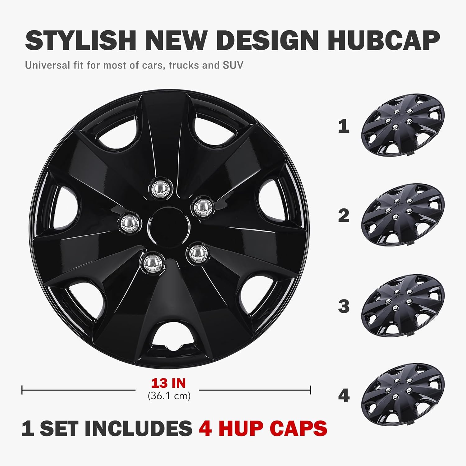 AUTOWIKI is a Professional Automotive Parts Manufacturer. We're committed to new technology and new product development, and introducing new automotive parts to the market continuously. We aim to provide our customers with high-quality products and let them discover more possibilities about their cars and have more fun in the process.๐ค๐คFeatureโ 100 % Brand new in box. Unused, unopened, undamaged item in its original packaging.โ Directly replacementโ Adds a stylish look to your vehicleโ Made of High Quality OEM Grade ABS Plasticโ Snap on style installation, no modification is needed๐ค๐คSpecificationType: Universal 13 inch HubcapsNumber in Pack: Set of 4Color: Black LacquerMaterial: High-quality PC๏ผABSInstallation Type: Snap-On๐ค๐คFitmentโ Compatible Wheel Diameter: 13 Inch Wheels Rims (R13)โ Will NOT fit over Aluminum Alloy wheelsโ This hubcap didn't fit the Toyota Prius serieโ If your steel wheel center is taller than the wheel frame, our hubcap couldn't fit either.โ NOT for Steel Wheels with Long Lug Nuts๐ค๐คPackage included4 x 13 inch Wheel Covers Hubcaps4 x Retention Ring๐ค๐คNoteโข Please make sure this is the right size/product for your vehicles before purchasing it. Measure by checking the number after the "R" on your tires.โข To Avoid any problem, please make sure that all hubcaps are installed properly to the wheel's rim edge. Test it before driving on the road.โข AUTOWIKI offers 30-day returns and a 12-month warranty. Once there is any quality problem with the product, please contact us immediately to solve the problem for you.