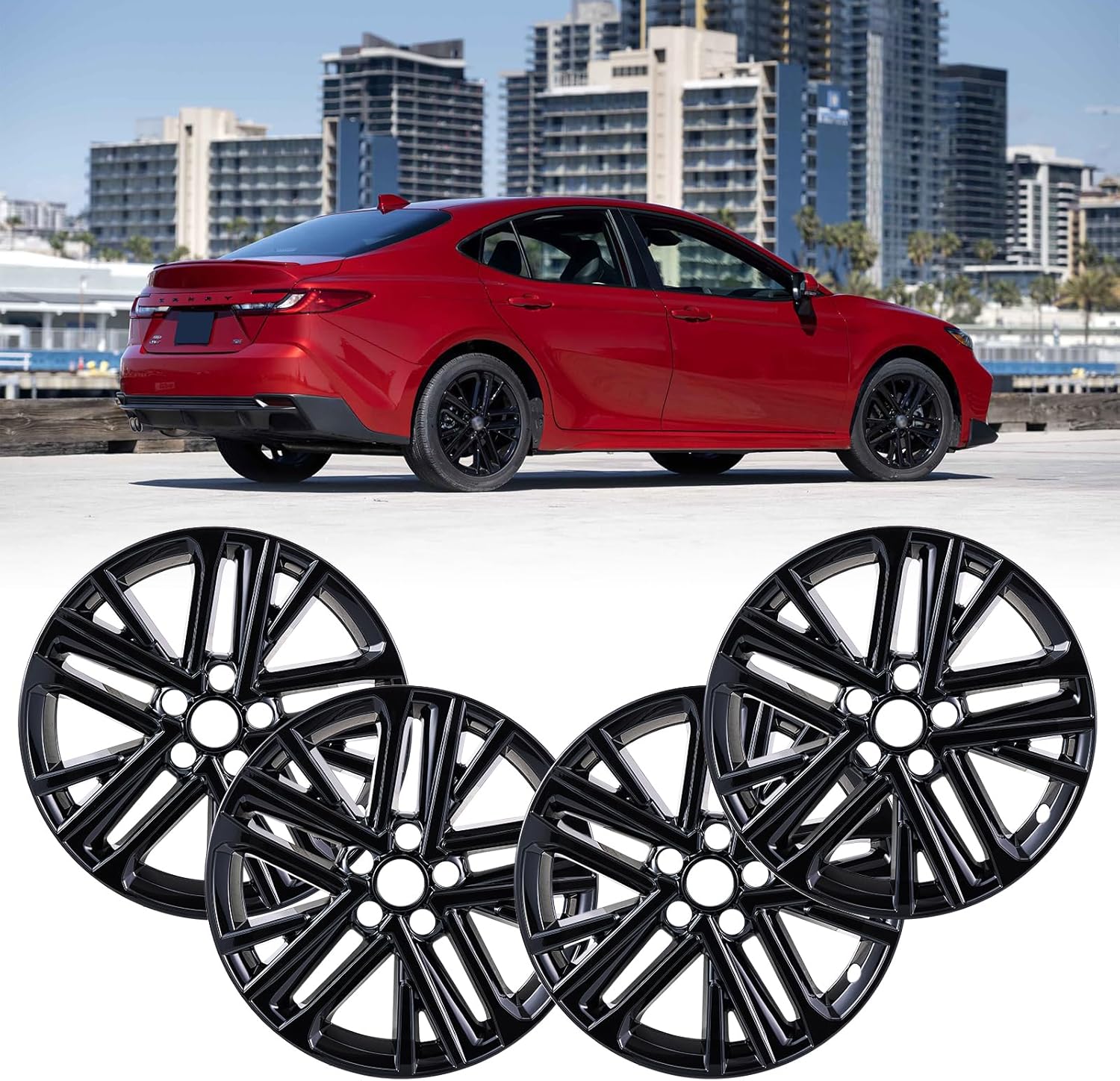 Product DescriptionThis is a 18 inches Glossy Black +Silver Wheel Skin covers for 2025 2026 Toyota Camry Hybrid Set of 4. Snap-on design replacement for factory Alloy Wheels (OEM# 42611-AQ020 & 42611-AQ030). Perfect Fit – Precision-molded for your Toyota vehicle model (2025-2026 TOYOTA CAMRY HYBRID, 18" Alloy Wheels) for an outlook upgrade. Wheel Protection – prevent and protect your wheels from dust, mud, rainwater and other debris. Style Upgrade – Available in premium Glossy Black + Silver finished for a stylish & shinny look. Lightweight & Durable – High-quality ABS+PC composite ensures durability and no impact on wheel balance.Tips:These wheel hubcap covers are designed to fit for 18'' Alloy Wheels only, pls make sure it matches your motor car’s wheels before ordering.Notes: To avoid any problem, please make sure that all hubcaps are properly installed into the wheel's rim edge. Test it before driving on the road. If you have any questions about the products, please do not hesitate to let us know via Amazon Message in time, we will do our best to solve it for you.