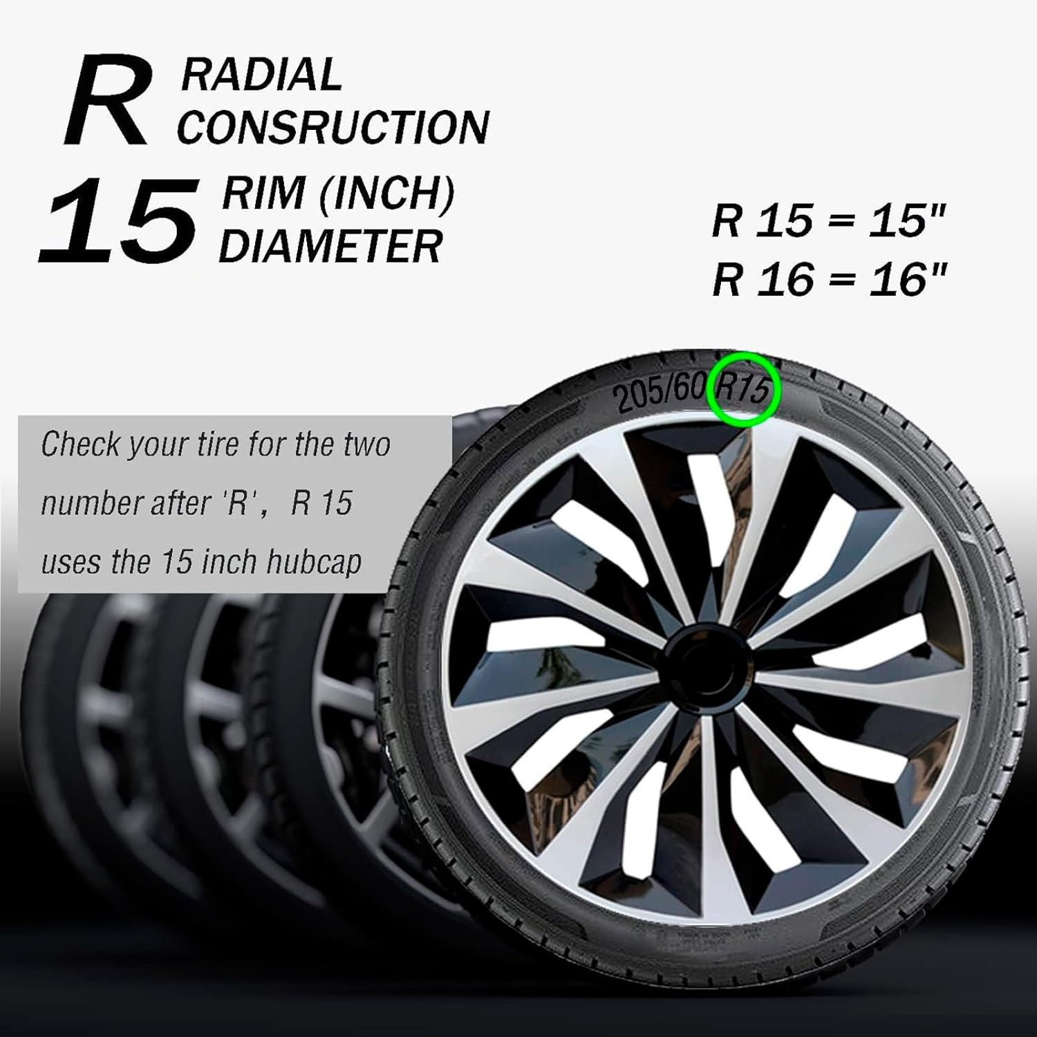 hubcaps 15/16 inch15/16" WHEEL COVER HUBCAPSSpecification:Size: 15/16 inchColor: Black & SilverInstallation Type: Snap-OnModel: Universal Hubcap for Iron WheelsMaterial: ABSPackage: 4 x 15/16" Hubcap Wheel CoversDesigned for 15/16" iron wheelsCheck your tire for the two number after R15 uses the 15 inch hubcaps.Check your tire for the two number after R16 uses the 16 inch hubcaps.