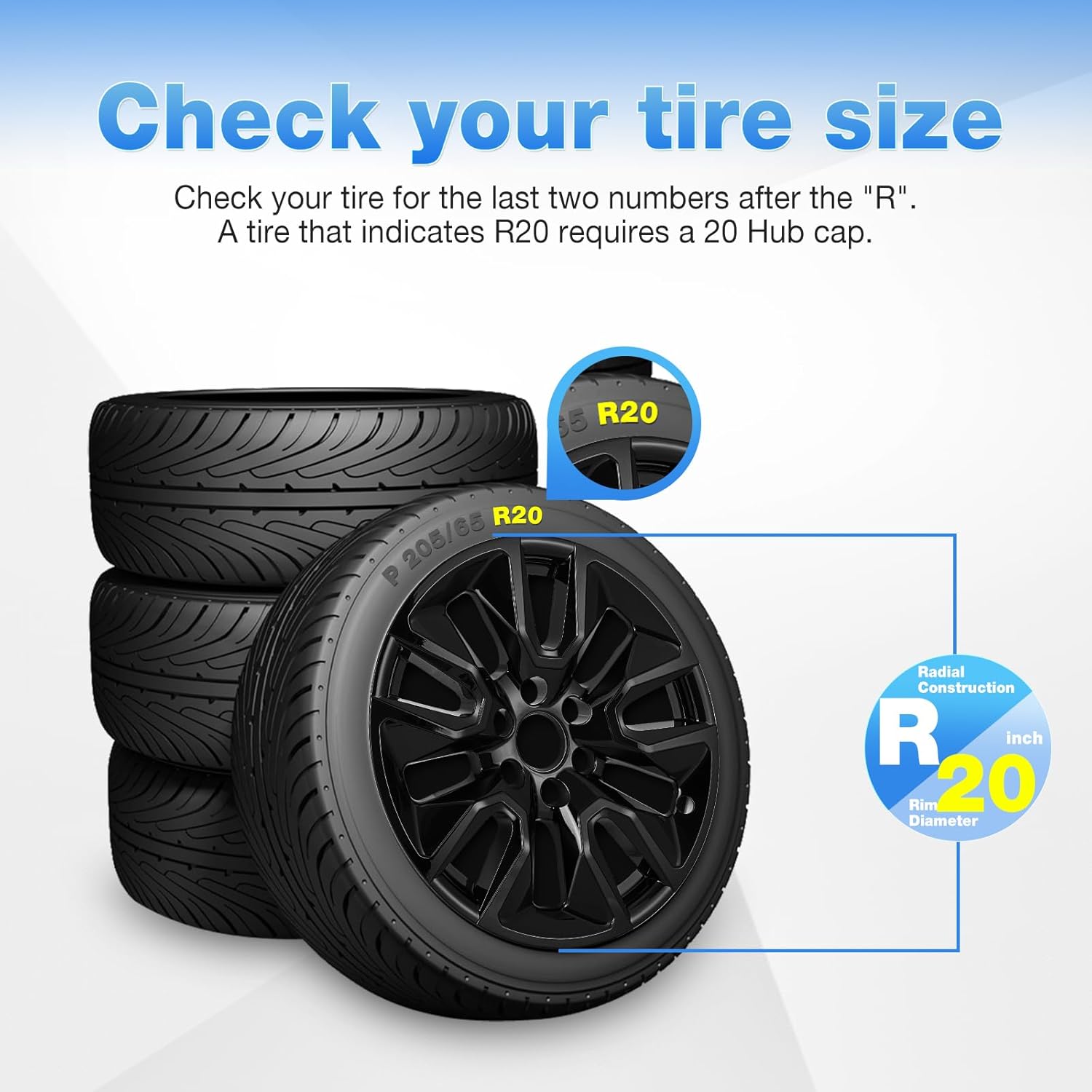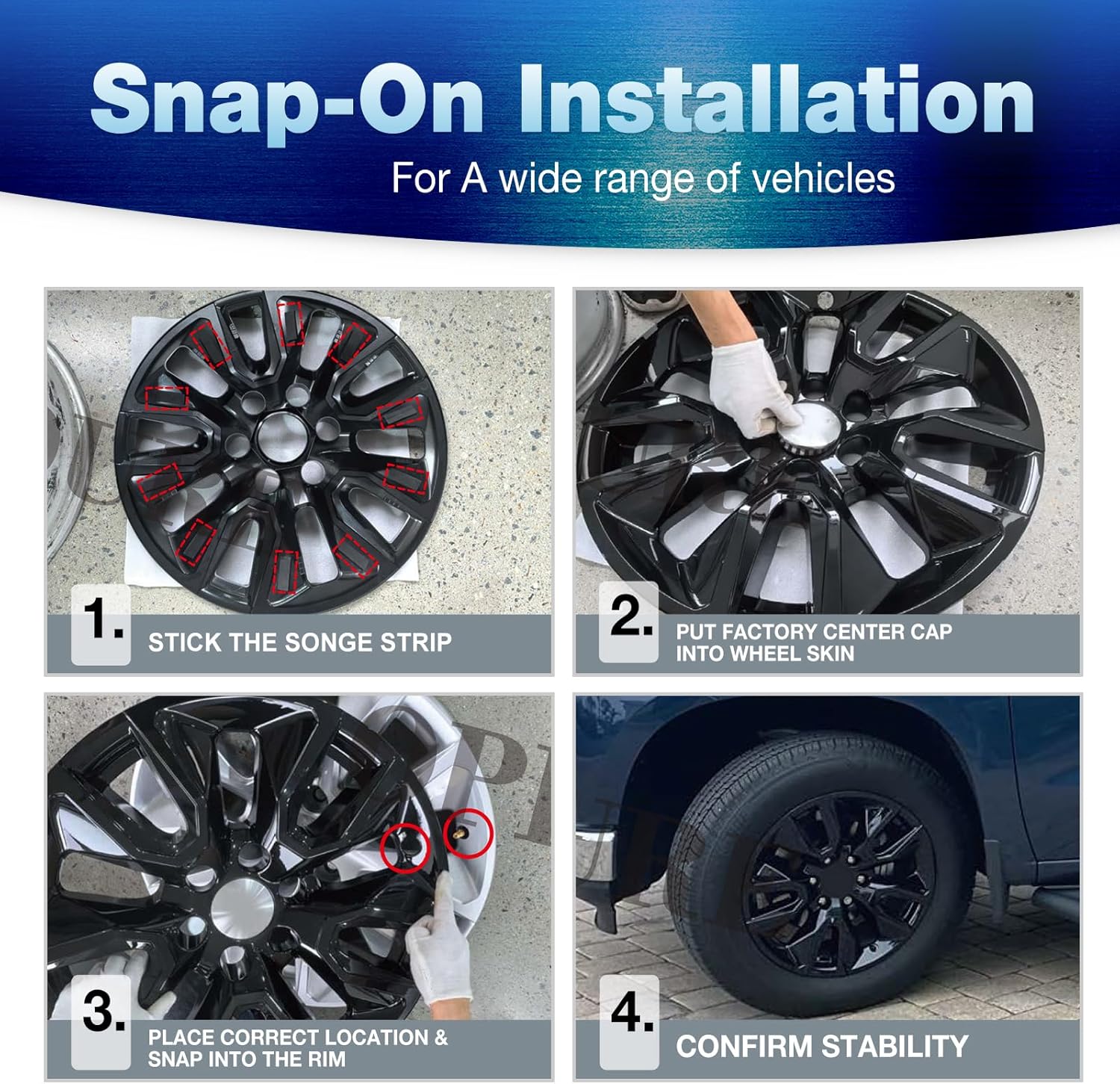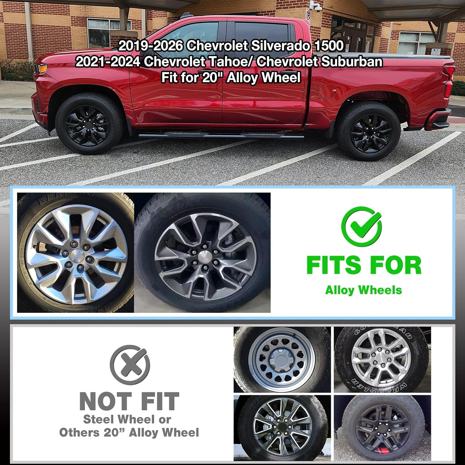 This item is a Brand New Replica Set of 4 20-inch Gloss Black ABS Wheel Skins replacement for chevy silverado 1500, Tahoe and Suburban.This 20" Wheel Skin Covers will Fit: Wheel Skins for 2019-2026 Chevrolet Silverado 1500;Wheel Skins for 2021-2024 Chevrolet Tahoe;Wheel Skins for 2021-2024 Chevrolet Suburban.It fits only 20 inch factory alloy wheels.[Tips: Just fit for aluminium alloy hub, NOT for any steel hub! Please note that these wheel skins are designed to fit flush with your factory alloy wheels, so make sure that your wheels match the exact shape of the skins shown to ensure proper fitment before ordering.]Features:Our premium replica wheel skins are made of an upgraded, sturdy ABS plastic and feature a rich black lacquer finish, strong and durable.With extra sturdy mounting clips and high quality ABS+PC material, for a super secure fit.The tires can be changed without removing this wheel skin in future daily fixing.They will add a great look on your Chevy for a long lifetime. Provide reliable protection against scratches, dents, and other types of damage to better protect your vehicle's wheels.Material: ABS + PCRim Size: 20 InchColor: Black LacquerCompatible with Factory Alloy Wheel OEM NO.: 23376221; 23376222; 84604785Package included: 4 pcs 20in Wheel SKinsNotes: To Avoid any problem, please make sure that all wheel skins are installed properly to the wheel's rim edge. Test it before driving on the road.If you have any questions about the product or have other questions, please contact us via Amazon Message in time, we will try our best to help you solve it.