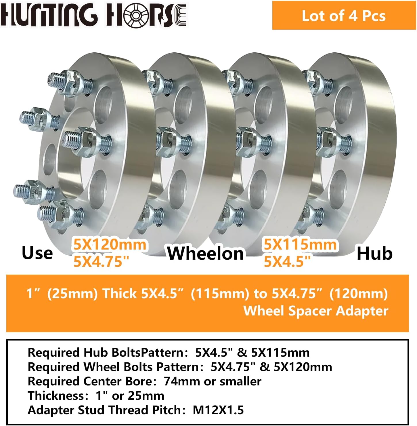Specification: Material: Aluminum, Steel Thickness: 1" Bolt Pattern Fit to Vehicle: 5x4.5"(114.3mm) Bolt Pattern Fit to Wheel: 5x4.75"(120.65mm) Adapter Center Bore: 74mm Overall Diameter: 164mm What You Get: 4 x wheel Adapters 20 x lugs