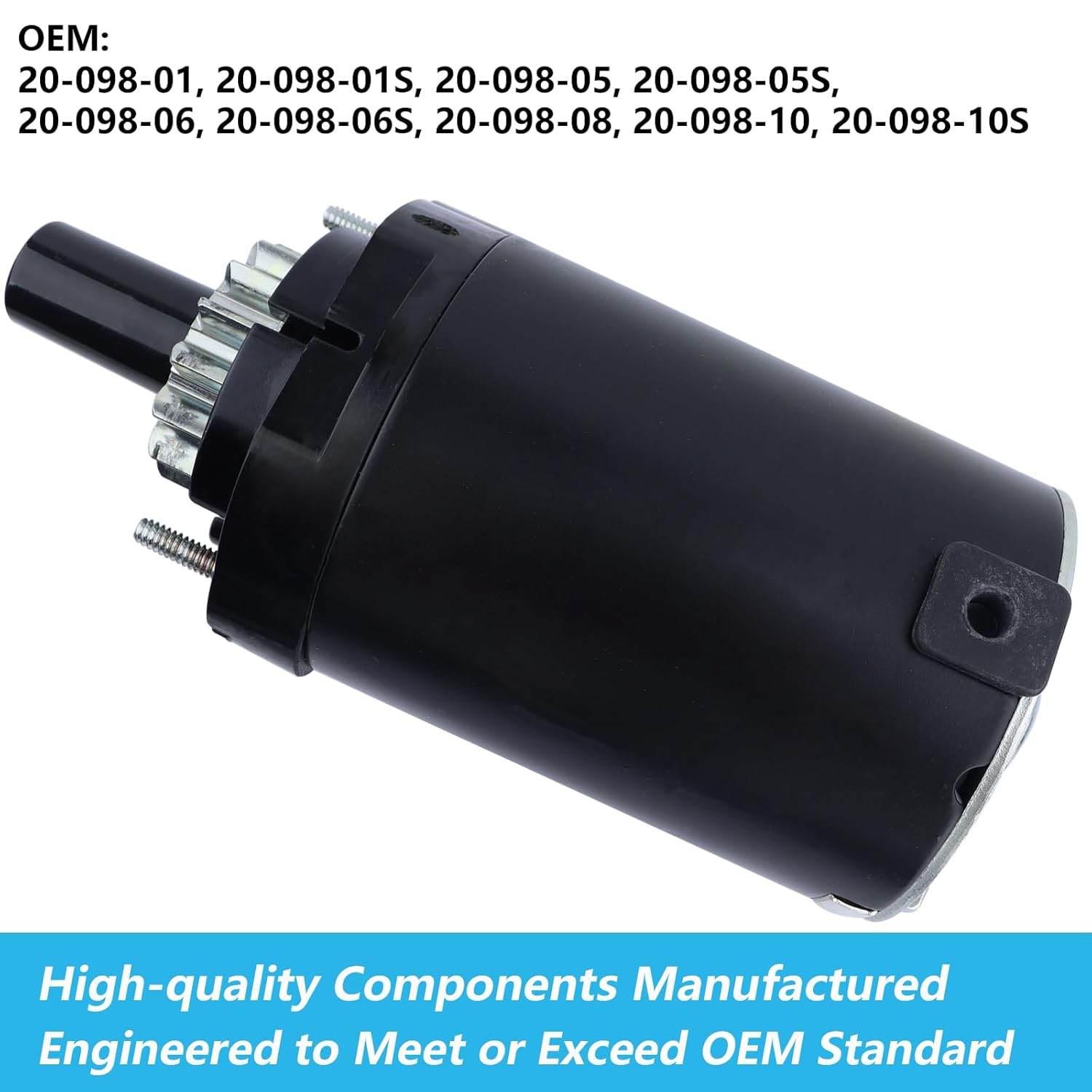 Ezamintaly starters are all manufactured with high-quality components for better durability and reliabilityCompatible With or Replacement For Kohler Courage Engine:SV540 SV541 SV590 SV600 SV610 SV620Compatible With or Replacement For Toro:TimeCutter Z4200 Riding Mower 2007-2009TimeCutter Z4220 Riding Mower 2008-2009TimeCutter Z5000 Riding Mower 2007-2009LX420 2006LX425 2007LX460 2006LX465 2007G4010 2007-2008G4012 2007-2008Compatible With or Replacement For New Holland Industrial:G4010 2007-2009G4012 2007-2009Compatible With or Replacement For Cub Cadet:i1042 Alli1046 AllZTT 42 AllZTT 46 AllLT1042 2005-2008LT1045 2005-2008RZT42 2006-2010LTX1040 AllLTX1042 AllLTX1045 AllXT1 LT42 AllProduct Specifications:Voltage: 12VRotation: CCWTeeth: 14Starter Type: PMDDReplacement OEM Part No.:20-098-01, 20-098-01S, 20-098-05, 20-098-05S, 20-098-06, 20-098-06S, 20-098-08, 20-098-10, 20-098-10S, KH-20-098-01-S, KH-20-098-05-S, KH-20-098-06-S, KH-20-098-08-S, KH-20-098-11-S, 2009801-05220, 5796, 5796N, SAB0145, 410-21065
