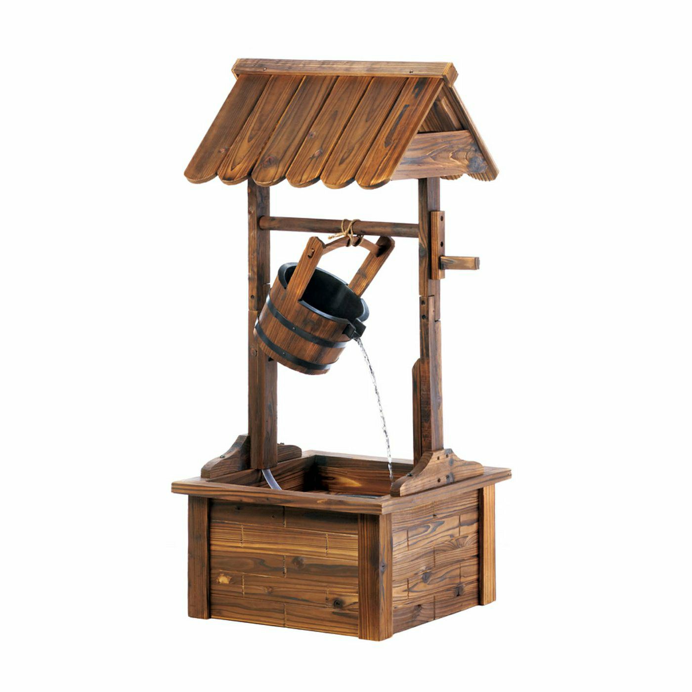 The magic of the town wishing well can be yours! This incredible wooden outdoor fountain features a delightful design complete with a roofed well and metal-banded bucket that spouts water. It's the perfect finishing touch for your yard or garden!