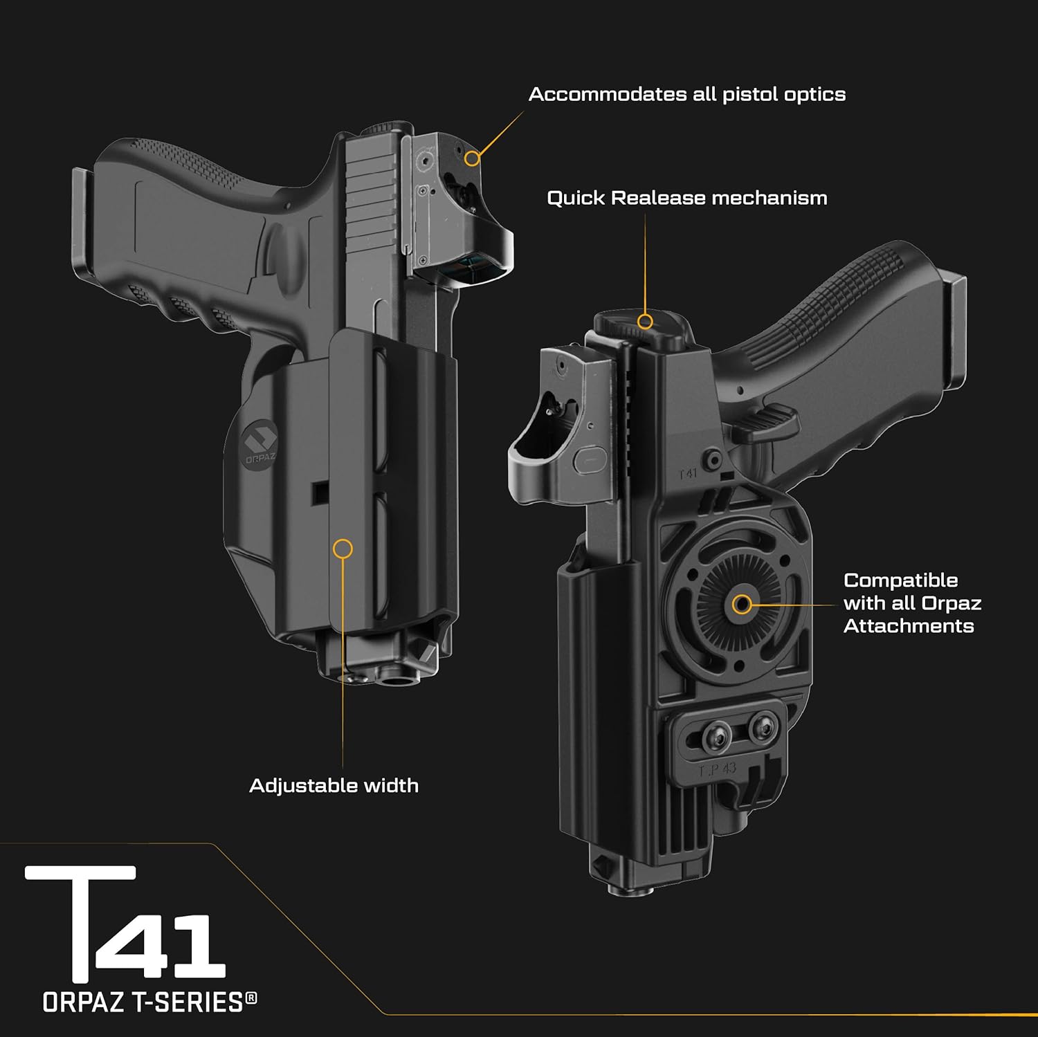 Orpaz T-Series T41 Adjustable Holster We have designed the T41 adjustable holster with tactical operators in mind. A well constructed and aesthetically pleasing Red-Dot Sights & Optics Holster with an innovative design that allows full adjustability for width, rotation, and retention. And compatible with all Orpaz adapters and attachments. Well Secured The Orpaz T41 adjustable holster provides security and quick release with the Thumb-Release button that is ergonomically placed on the inner part of the holster to give you easy and exclusive access to your pistol. Compatibility Compatible with CZ P07 pistols with mounted red-dot sights & optics.