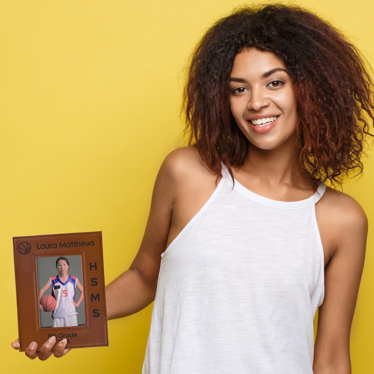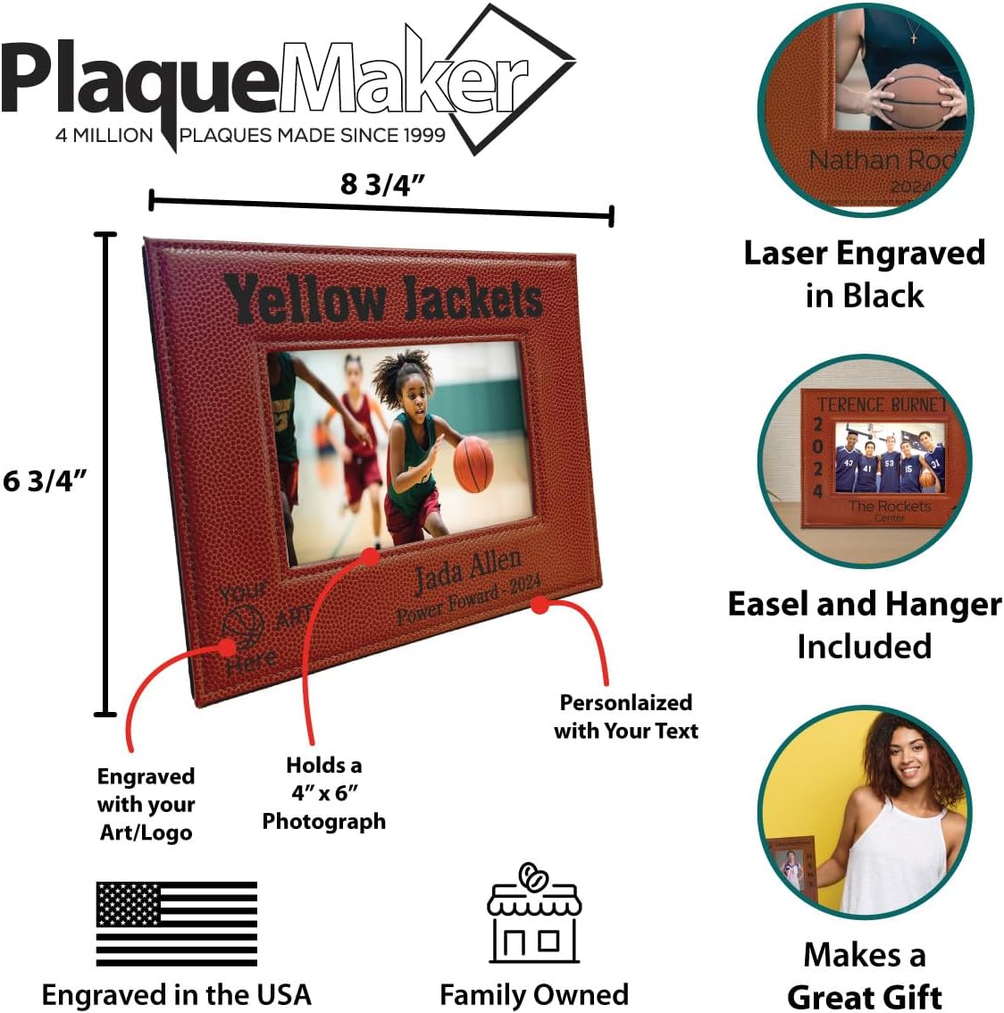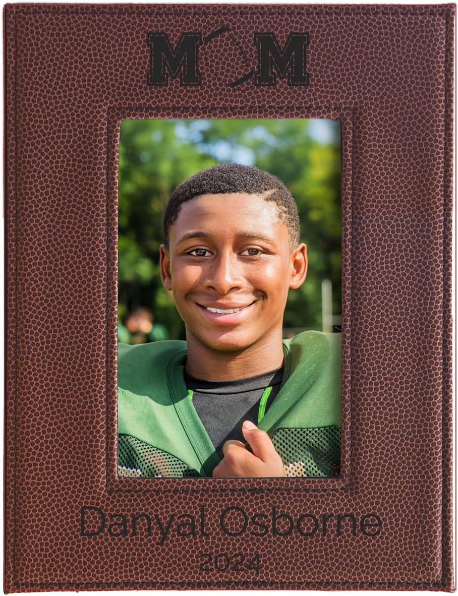 Cherish your favorite athlete or team with this customizable picture frame, perfect for displaying a 4x6" or 5x7" photo. The frame's sleek design features a rich, textured faux leather exterior with embossed lettering and a vibrant image window. Celebrate your sports star's achievements or commemorate a championship season with this thoughtful gift. Ideal for coaches, players, or devoted fans, this frame adds a personal touch to any room. Crafted with care to ensure lasting quality, it's a timeless way to showcase your team pride.