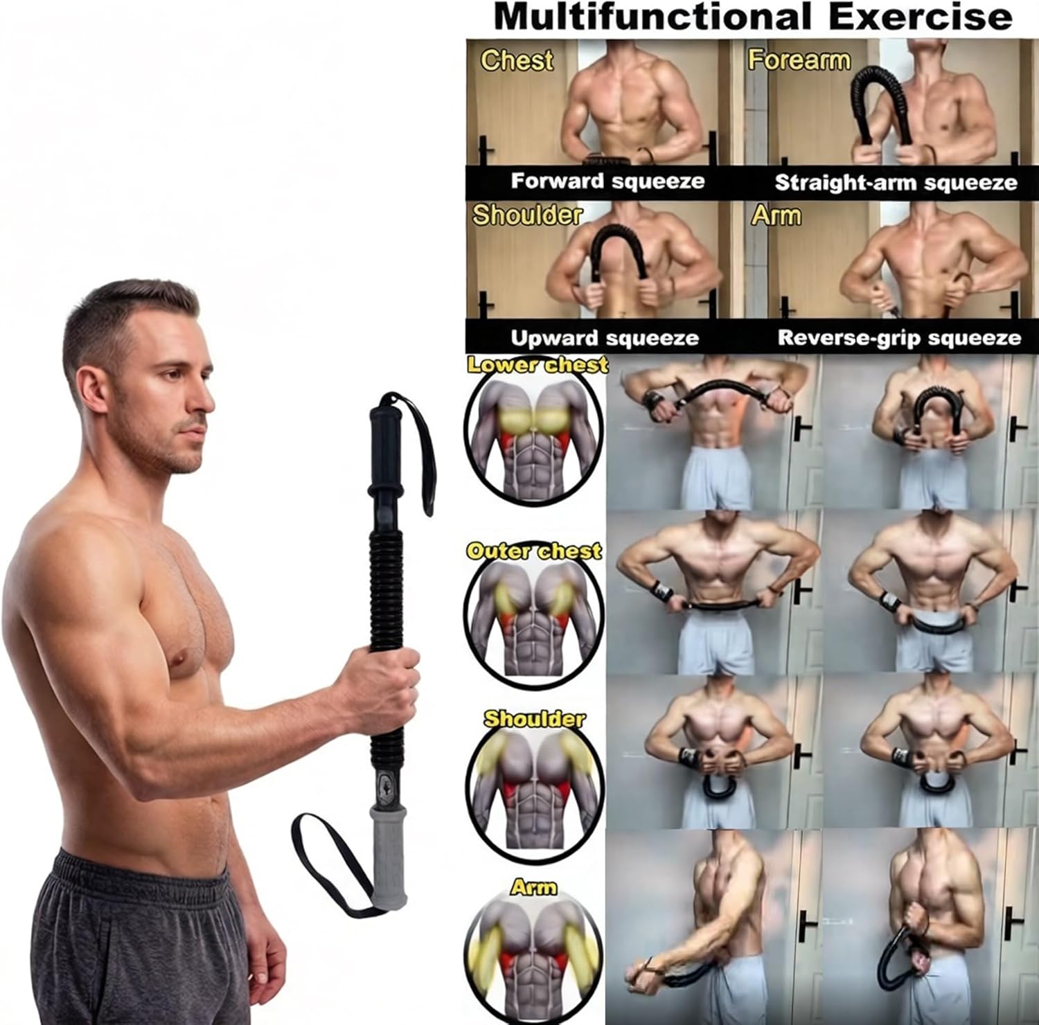 This Power Twister Bar is robust, durable, versatile, and portable, suitable for home gyms, offices, and even outdoor travel, providing upper body workouts.COLOR: BlackMATERIAL: High-strength steel spring + plastic handle + steel tube body + ropeSIZE SPECIFICATIONS:66 lbs/30 kg, Length 23 inch/58.5 cm, Spring Length 10 inch/25.3 cm, Spring Diameter 37 mm77 lbs/35 kg, Length 23.2 inch/59 cm, Spring Length 10.2 inch/26 cm, Spring Diameter 37.6 mm88 lb/40 kg, Length 24.6 inch/62.5 cm, Spring Length 11.8 inch/30 cm, Spring Diameter 41.6 mm110 lb/50 kg, Length 25.2 inch/64 cm, Spring Length 12.4 inch/31.5 cm, Spring Diameter 42.4 mm132 lb/60 kg, Length 25.6 inch/65 cm, Spring Length 13 inch/33 cm, Spring Diameter 43 mm154 lb/70 kg, Length 26.7 inch/68 cm, Spring Length 13.7 inch/35 cm, Spring Diameter 43.6 mm176 lb/80 kg, Length 27.1 inch/69 cm, Spring Length 14.5 inch/37 cm, Spring Diameter 44.2 mm198 lb/90 kg, Length 27.5 inch/70 cm, Spring Length 15.7 inch/40 cm, Spring Diameter 45 mm220 lb/100 kg, Length 28.1 inch/71.5 cm, Spring Length 15.3 inch/39 cm, Spring Diameter 45.6 mmSUITABLE FOR:66lbs/30kg, 77lbs/35kg, 88lbs/40kg, 110lbs/50kg, are suitable for beginners132lbs/60kg, 154lbs/70kg, 176lbs/80kg, 198lbs/90kg, 220lbs/100kg, are suitable for people with greater strengthAPPLICABLE OCCASIONS:Home, Office, Gym, OutdoorTRAINING AREAS: arms, Upper Body, shoulder, chest, bicep, forearm, back PACKAGE CONTENTS:Black Power Twister Bar x1