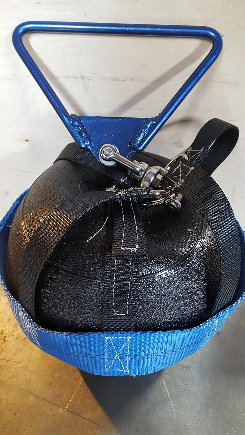 PRACTICE ONLY Gym and Wallet Friendly indoor Weight Throw. Using a custom bag made of high-strength polyester webbing the harness is set for up to a 10 inch slam ball. se with Rep V2 and Rage slam balls or supply your own. It has added straps that hold the slam ball down in the harness for a secure fit. The polyester straps are 4,500 lb and 12,000 lb rated for strength. Polyester does not stretch and wears better than the nylon or cotton. Water resistant and can be thrown outdoors and do not cause the massive divots wivel is stainless steel and the handle is painted and heat cured. When thrown inside the Weight Throw lands with a thunk and the slam ball absorbs the impact with little bounce and a roll rather than the BANG of a normal weight throw and the clatter of handle and hard weight on the gym floor. If the handle is between the slam ball and the floor the pliable slam ball takes the impact rather than the gym floor. The handle is made from 1144 Stressproof 3/8" steel rod with over 100,000 psi yield strength. That is twice to three times normal handles made in China. We use a solid steel triangle support piece fully 360 degree welded for added durability, break and bend resistance. Nylon shoulder washers are used in the handle to give a solid smooth rotation. We use D rings for the transition to the swivel so that wear on the straps is even across the entire strap. Inexpensive and preserves the basketball floor or the mats that it hits. Controlled after roll and bounce. Using the slam ball that is rugged and uses sand instead of lead is a great safety factor. And if the slam ball breaks after hard sustained practices it is easily replaced for less than $60. The two compromises are that the weight throws are about 1.8 lbs heavier than regulation and a few inches longer than the 19" allowed. But the extra weight and length almost balance each other out so that the feel is close to a regulation weight throw.
