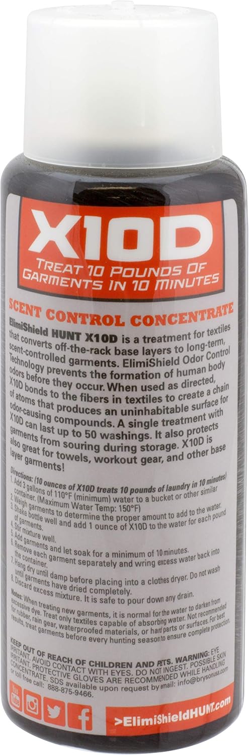 ElimiShield HUNT X10D is a treatment for textiles that converts off-the-rack base layers (Under shirt, Underwear, Socks, Thermal Underwear, gloves, etc) to long-term, scent-controlled garments. ElimiShield Odor Control Technology prevents the formation of human body odors before they occur. When used as directed, X10D bonds to the fibers in textiles to create a chain of atoms that produces an uninhabitable surface for odor-causing compounds. A single treatment with X10D can last up to 50 washings. X10D is also great for back packs, tobaggins, beanies, towels and other base layer garments!