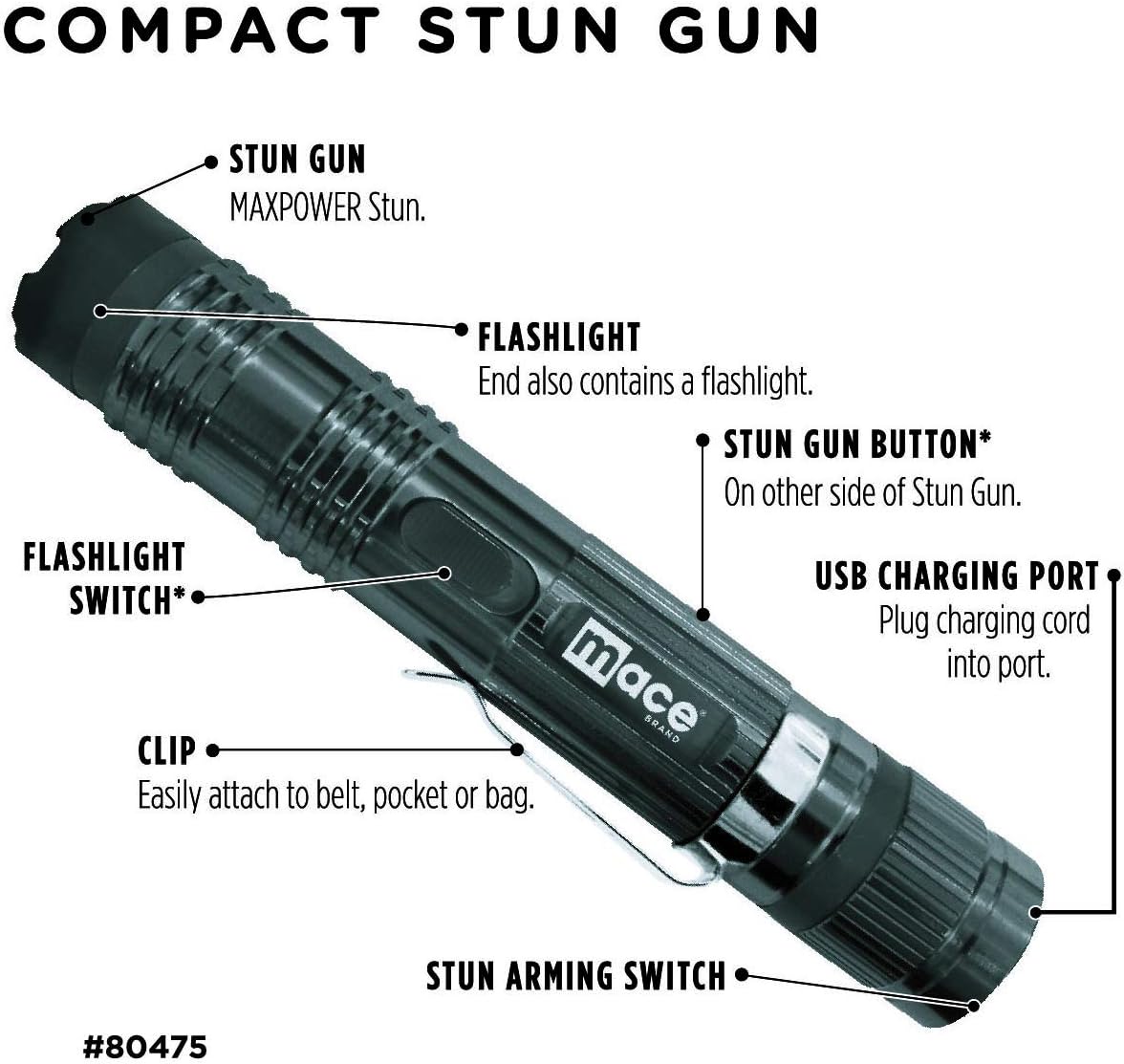 Mace Brand Compact Stun Flashlight, Features Powerful LED Light with 3 modes, Includes Belt Clip and Power Cord, Great for Self-Defense, Black