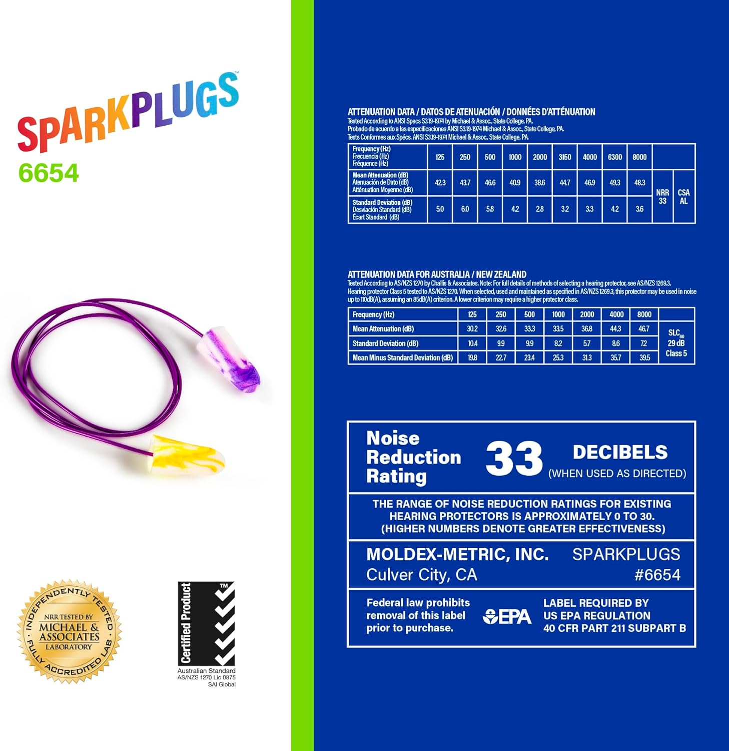 SparkPlugs® Corded Disposable Foam Earplug, 100 pairs per dispenser. Hang and store earplugs around your neck, so you keep track of them. SOFT COMFORTABLE FIT SparkPlugs earplugs are made of extra-soft, extra light foam. Their tapered shape fits easily in the ear canal, and seals gently and snugly. They’re so comfortable you’ll forget you’re wearing earplugs. HIGHEST INDEPENDENTLY TESTED NRR 33 EARPLUGS SparkPlugs earplugs offer the highest independently tested NRR 33, making them suitable for most noisy environments. So, while they look like fun, they provide serious protection. Made in America.