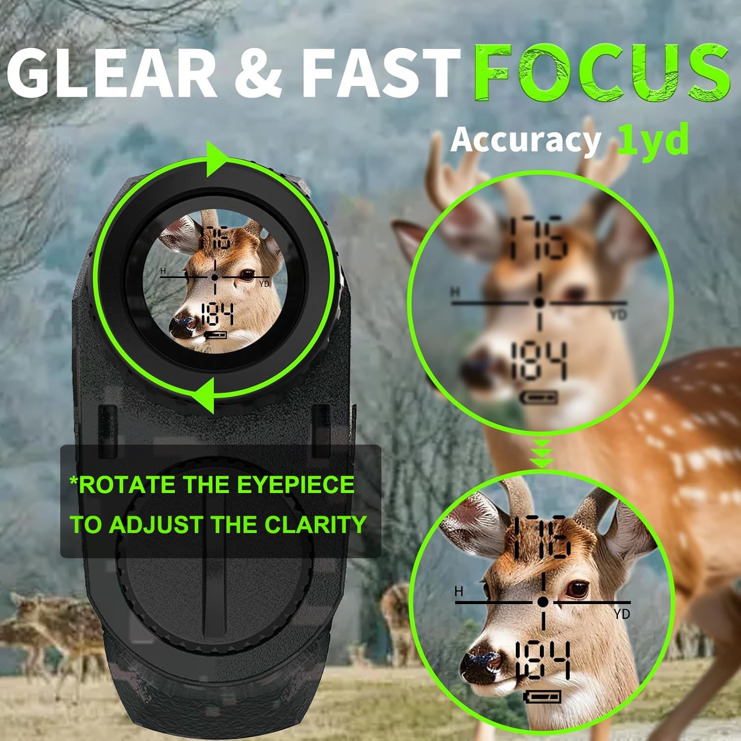 Camouflage Hunting Rangefinder – 1000-4000Yard Distance + Black Ring Target ConfirmationThis rugged, IPX4-rated rangefinder is built for outdoor hunters. With ±1yd accuracy, 6X magnification, and a camouflage shell, it delivers fast and reliable measurements from 5 to 1000 yards—even in fog and light rain.Fast Target Lock with Visual Feedback Powered by Pulse Acquisition Technology, the unit flashes a black ring inside the display when it successfully locks onto your target. No vibration—just visual confirmation, even in high-stress moments.Multiple Range Modes for Tactical Flexibility Supports line-of-sight, slope angle, and horizontal distance. Golf / Scan modes let you adapt to variable terrain or track moving targets with ease—great for bow or rifle hunters.Clear Optics + Transflective LCD High-contrast display and 6X zoom bring distant game into sharp focus. Easy to read in both bright sun and shaded woodland.Field-Ready & Simple to Use Just point and click. Easy for beginners, reliable for experts. Whether glassing open country or ranging from a blind, this tool won’t slow you down.