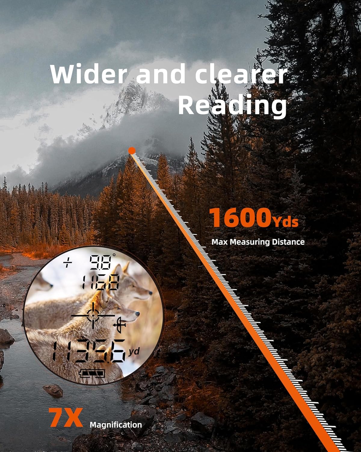 • Fast and Accurate Reading: Adopting the latest Al technology, 7x magnification, measuring distance highly precise with +/- 1 yard in 5~1600 yards, measuring speed is fast and clear, achieving what you see is what you get. Very ideal for hunting or any other wildlife viewing.