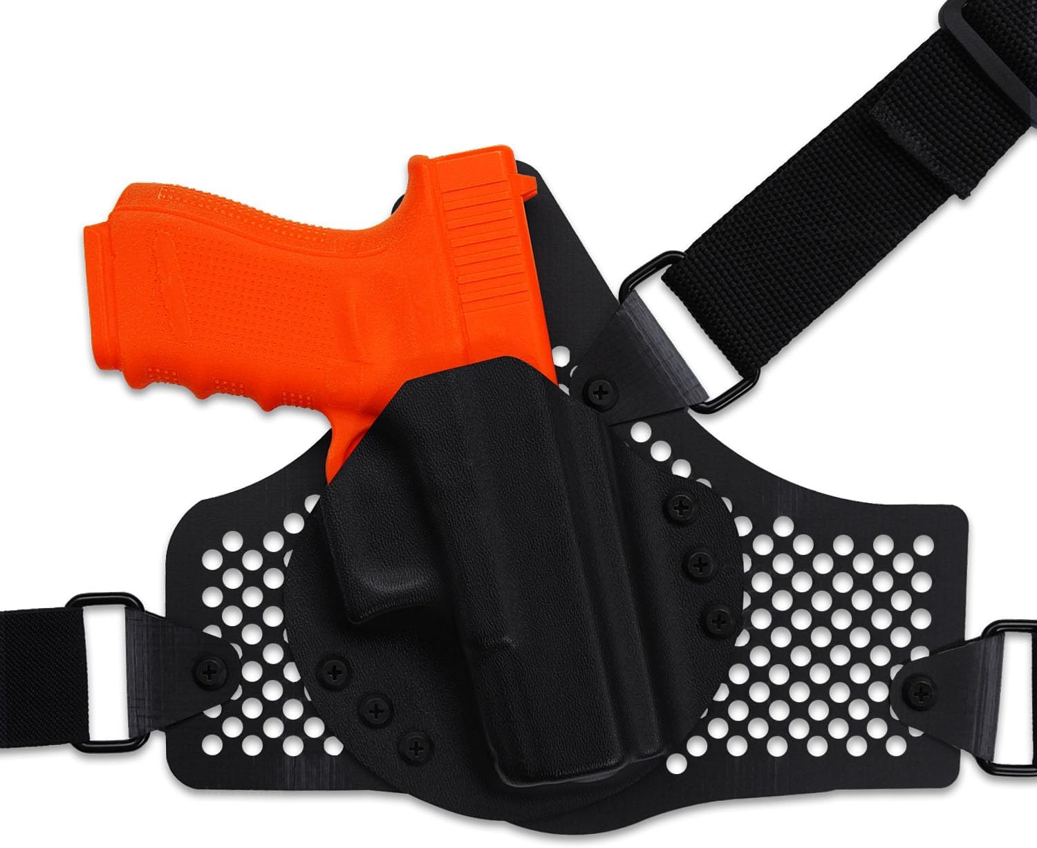 The Chest Carry Rig is engineered for makers, outdoorsmen, and professionals who want a stable, customizable chest-mounted carry solution for holsters, tools, and field gear. Each rig anchors securely with a 1.50 inch elastic strap and a 1.50 inch polypropylene webbing strap, providing a comfortable, adjustable fit for a wide range of body types. With more than 280 mounting holes on the backer plate, users can fine tune cant angle, attachment layout, and strap placement for their preferred carry setup. The field-repairable strap system uses slip locks to maintain secure alignment without standard stitching, allowing simple adjustments or repairs during long-term use. Every variation delivers durable performance and dependable retention for holsters and modular gear. Each kit includes all backer hardware, sling mounts, and straps needed for immediate setup. Made in USA. Specifications Material: (Select Above) Carry Orientation: Ambidextrous Backer Color: (Select Above) Strap Type: Elastic and Polypropylene Webbing (1.50 inch) Mounting Holes: 280+ positions Sling Mounts: Included with hardware Made in USA