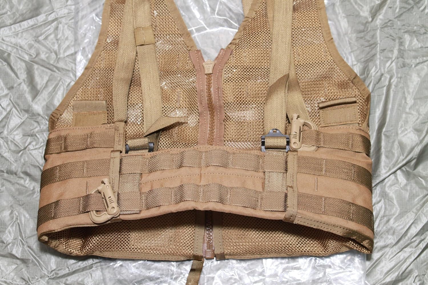 The height is adjustable using the rear webbing straps, and the waist features a sideways 'T' shaped webbing tab on each side that can be slotted in at any place on the belt to adjust width. The vest is covered in MOLLE straps. It can be zipped, buckled or both and can be worn over body armor.