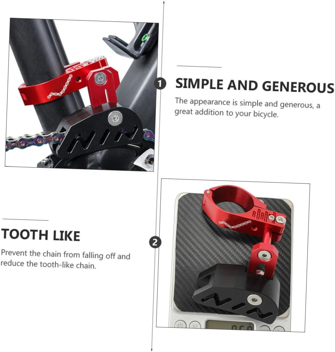 Package List 1 x chain guide 2 x adapters 3 x wrenches Characteristics -Color: Red Bike Guide Wheel Accessories -Size: 9.00X8.00X6.00cm/3.54X3.14X2.36in Single Disc Chain Guide -Material: Aluminum Alloy, POM Chainring Guard - Comes with 2 pieces sleeve adapter,convert 34.9mm to 28.6mm or 31.8mm diameter seat post Bike Tensioner. - Installed this onto seat post, caneffectively prevent chain falling or chain from bumping Positive Negative Teeth Stabilizer. - Light in weight design, will not add muchburden to cycling, saving effort during use Bike Accessories. - This chain guide set is suitable forfixed gear, road bike, mountain bicycle Bike Chain Deflector. - This product is made of aluminum alloymaterial processed by CNC technology Front Derailleur.Goods DescriptionSingle Disc Chain Guide Features thealuminum alloy and POM material, which has high durability, not easy to deform.Bike Chain Deflector Fine workmanship, ensures practicality.Bike Guide Wheel Accessories This chain guide stabilizer tensioneris made of , which can withstand use