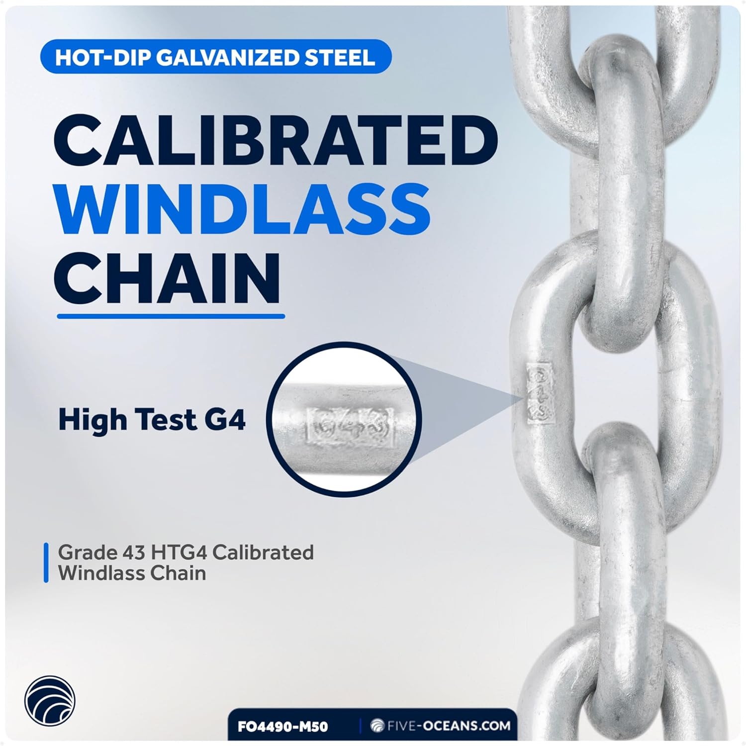 Grade 43 HT & Marine Grade - Boasting a Grade 43 HT (G4) type, this boat anchor chain is a marine-grade product from the trusted Five Oceans brand.
