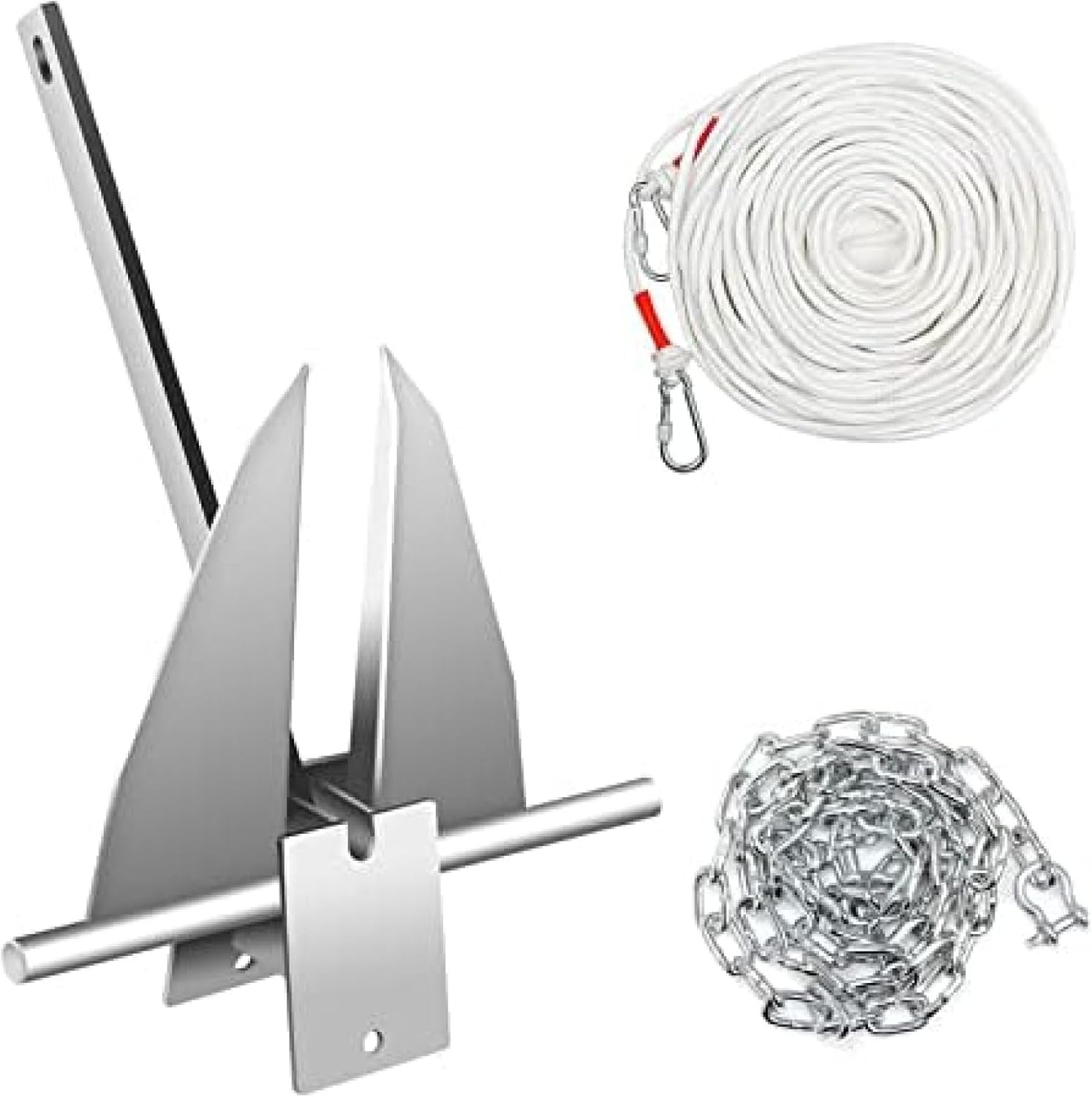 Our anchor is a complete set of anchors, It includes an 13 pound boat Anchor, a 99 ft of 1/3 ''nylon rope, a 6.6 ft of 1/3" chain,shackles & swivels: 3/8'' / 9 mm, after you receive the boat anchor kit, you can use it directly without purch asing any other accessoriesThe galvanized anchor allows the anchor to grip the ground faster during launching, ensuring that the vessel can be quickly and completely secured, providing more reliable security for your route.Galvanized anchors are made of hot-dip galvanized steel, which can maintain high strength and excellent stability, and can maintain long-lasting performance even in seawater.Galvanized ship anchor,fluke style anchors are perfect anchors for sand or mud bottoms. providing more reliable security for your route.1 x Boat Anchor1 x Nylon Rope1 x Chain1 x Shackles & SwivelsWeight: 13 lb / 6 kgMaterial: Galvanized SteelRope: 99' x 8/17'' / 30 m x 12 mmChain: 6.6' x 1/3'' / 2 m x 10 mmShackles & Swivels: 1/2'' / 13 mmSuitable Boat: 22'-32' / 6-10 mGalvanized Fluke AnchorHigh Strength Nylon RopeGalvanized Anchor Chian ShacklesGalvanized ship anchor,fluke style anchors are perfect anchors for sand or mud bottoms. providing more reliable security for your route.Our heavy duty boat anchor's perform well under mud and sand conditions,It can also be used in salt water or fresh water it is a good helper for navigation