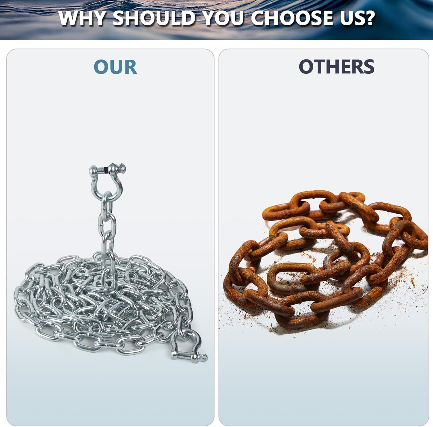 Product description:Product Name: Anchor Chain,Anchor Lead Chain,Anchor Chains for Boats,Boat Anchor Chain for BoatsMaterial: Galvanized SteelChain Size:1/4in X 4ft/6ft/10ft/15ft,5/16in X 5ft/6ft/10ft/15ft/20ftShackle Size: 5/16in/3/8in