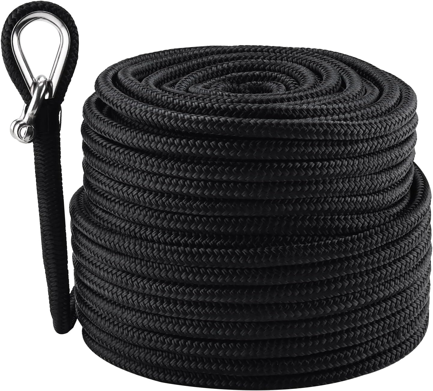 • 3/8' x 200" double braid nylon rope includes a spliced stainless steel eye thimble for easy attachment to your anchor,swivel,chain and so on