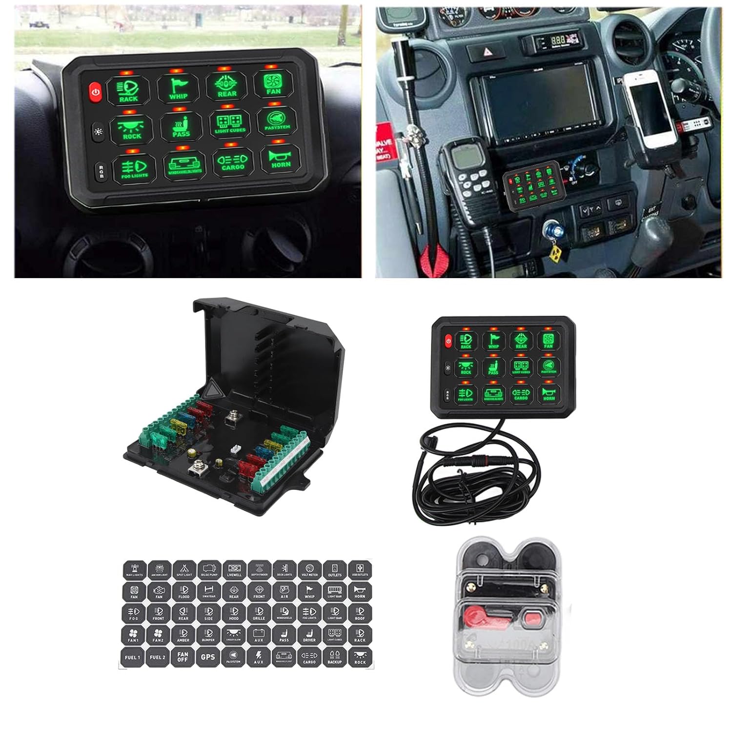 Spec: Item Type: 12 Gang Switch Panel Material: Plastic + Metal Backlight: RGB Style Light Source Type: LED Protection Class: IP65 DC Voltage: 12V-24V DC Current: 12V 60A, 24V 80A Power: 960W/12V, 1920W/24V Operating Temperature: - 40 ℃ - + 85 ℃ Applicable: Such as trucks, ships, offroad, power sports, ships, atv, utv, suv, cars, buses, heavy duty vehicle etc. RGB Function Introduction: Switch: Switch with memory function, automatically remember the last setting Backlight brightness adjustment Short press: 5 levels of brightness adjustment (100 percent, 75%, 50%, 25%, 10%). With each press, the brightness switches to a different >. Long press: to enter setting mode, choose between momentary mode and strobe mode. Long press again to exit setting mode. Backlight color adjustment Short press: switch to single color (loops from 1-8 in order) 1. Red 2. Orange 3. Yellow 4. Green 5. Cyan 6. Blue 7. Purple 8. White Long press: gradual change, jump, breath switch (cycle 9-11 in sequence) 9. gradual change: red orange yellow green cyan blue violet 10. Jump: red orange yellow green cyan purple 11. Breathing: Red Orange Yellow Green Blue Blue Purple 3 lighting modes Constant light, instantaneous mode, strobo mode, adjust at will Step 1: Press and hold the brightness adjustment button for 1 second. When the red backlight flashes, enter the momentary setting state Step 2: Press the button you want to set (the instantaneous mode can be selected between 12 buttons), then press the ON OFF button to confirm, and the setting is successful. Step 3: Press the ON OFF button again to exit the setup mode. Strobe mode Step 1: Press and hold the brightness adjustment button for 1 second, and the red backlight will flash (Note: This is the instantaneous setting state, please refer to the specific steps). Step 2: Then short press the brightness adjustment button, and when