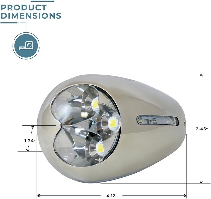 This robust docking light boasts a high-gloss, 316-grade stainless steel housing, ideal for tough outdoor conditions. Its superior corrosion resistance and polished finish ensure durability. With a 400-lumen bright white (6300K) output using just 3.5 watts at 13.6V, it's energy-efficient. Fully sealed and waterproof, this IP66-rated light is trusted by leading U.S. boat builders. Its power-saving LED tech features reflective surrounds and a 'water clear' lens. A " wire access hole is required for installation, and mounting screws are included. It's used in Crownline, Forest River, and Crest boats.