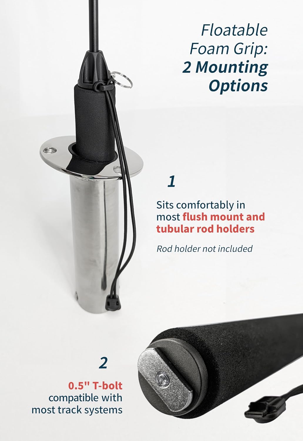 • 【 Easy Installation 】 Mount boat stern light pole seamlessly to boat by sliding floatable foam grip base into flush mount/tubular rod holder (not included), or attach built-in 0.5-inch T-bolt to compatible kayak tracks—no tools needed