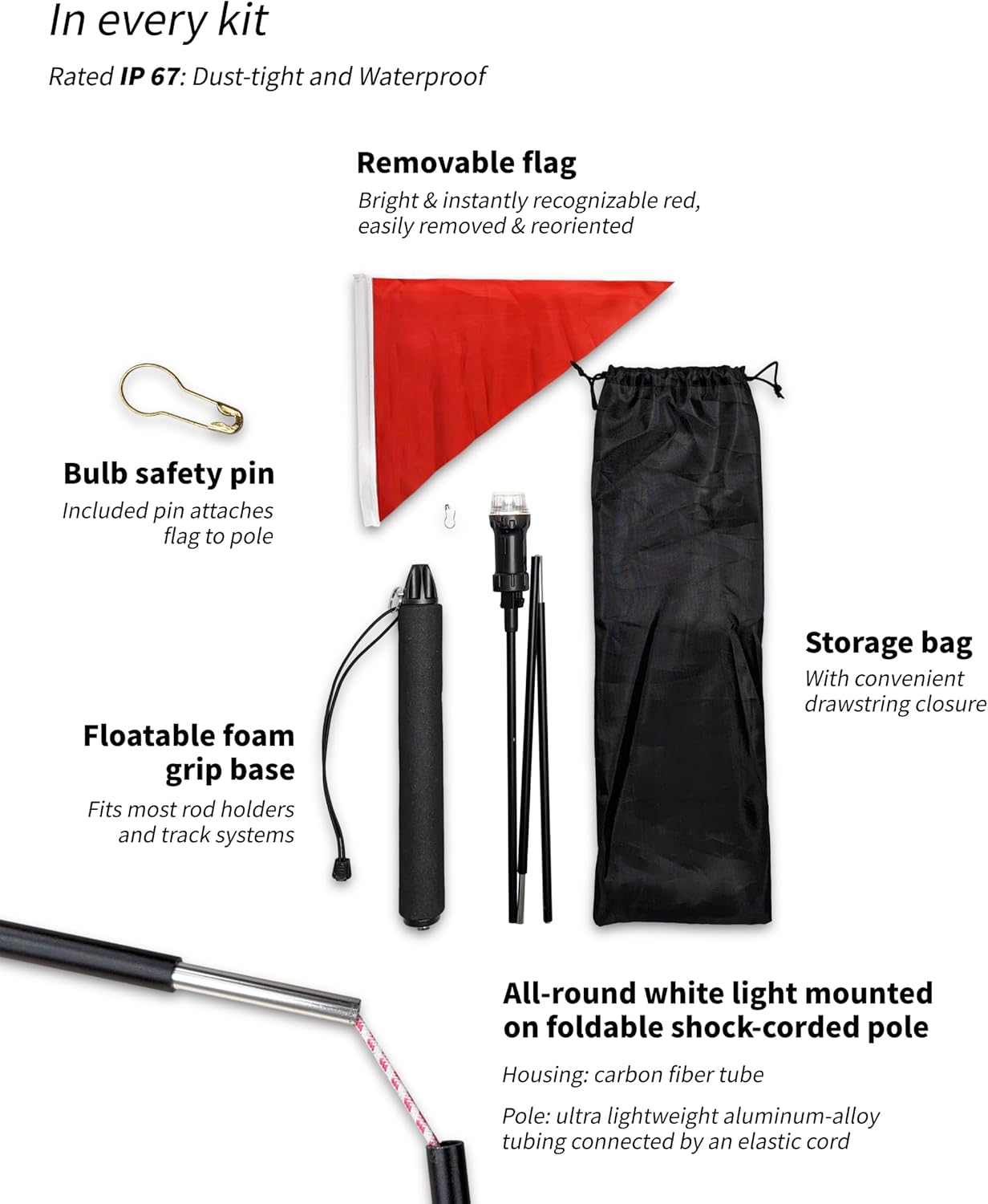 • 【 Portable Design 】 Kayak safety flag can be removed and 4-foot shock-corded kayak flag pole can be collapsed to 16 inches for easy storage and transportation, perfect for small boats without 12V electrical systems