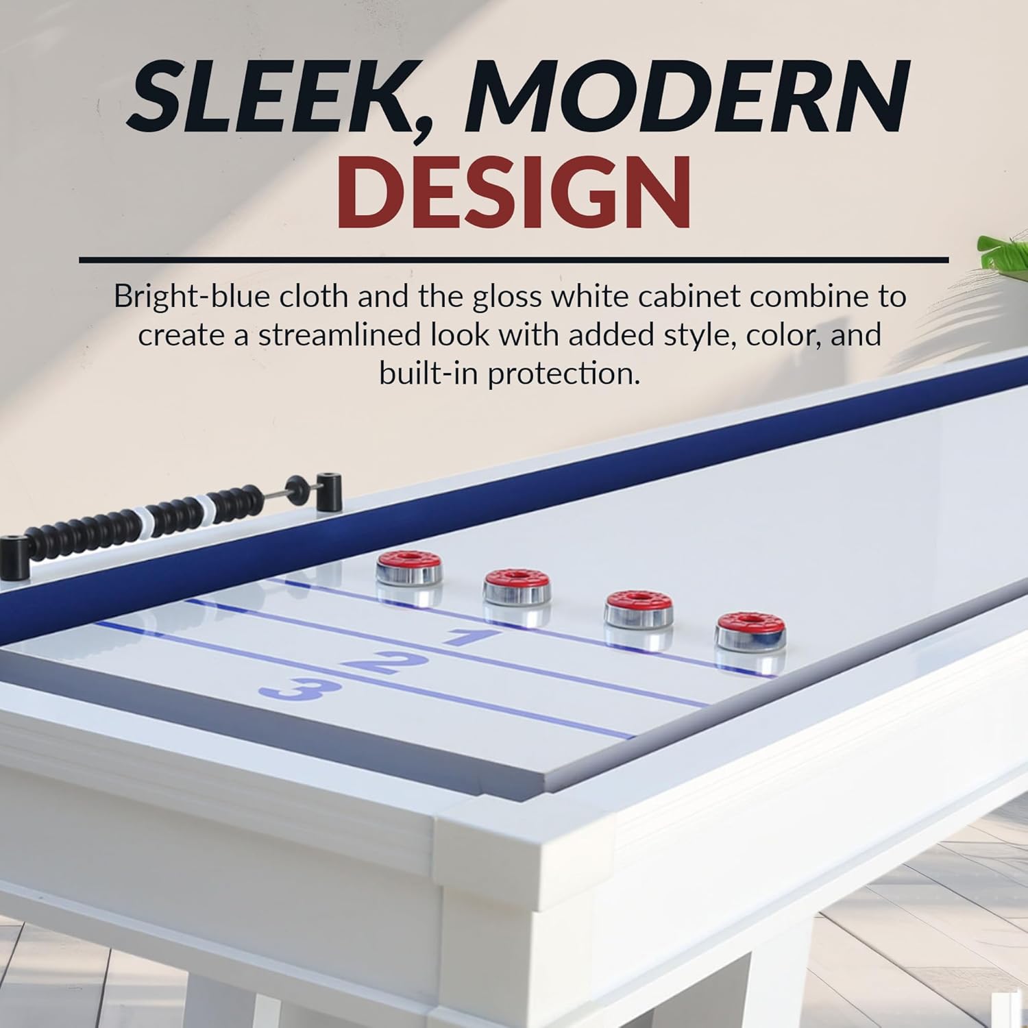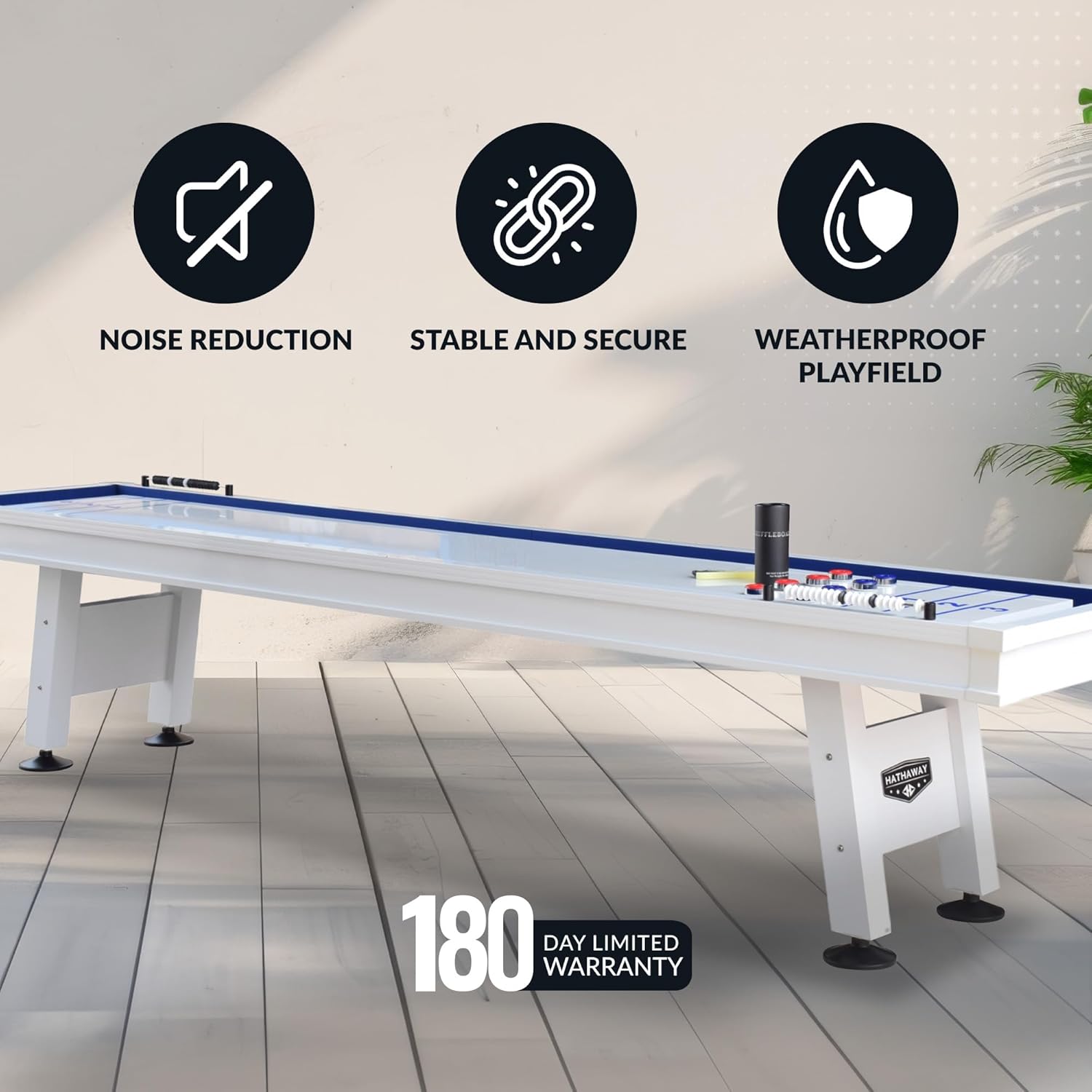 The Hathaway Crestline 12 Ft Outdoor Shuffleboard Table brings lasting performance and sleek design to patios, decks, and yards. Built specifically for the outdoors, this shuffleboard table is engineered for year-round use, featuring a 1.25-inch-thick composite playfield that resists moisture and warping. Its durable extruded aluminum frame provides structural strength while maintaining a lightweight profile for long-term stability. Finished in clean white, the Crestline adds a contemporary look to any outdoor entertainment space. Designed for durability without sacrificing performance, this shuffle board table includes weather-resistant blue inner walls and gutter cloth that reduce noise while shielding internal components from sun exposure. The oversized tubular steel legs are supported by cross truss beams, enhancing overall frame integrity. Six-inch adjustable leg levelers provide a balanced surface for accurate play, even on uneven terrain. With a total footprint of 144 inches long by 29 inches wide by 31 inches high, this 12 foot shuffleboard table accommodates competitive matches while fitting seamlessly into a variety of outdoor settings. A complete shuffle board set is included, featuring four blue and four red pucks, surface wax for smooth gliding, a deluxe abacus scorer, and a fitted weatherproof cover to protect the table when not in use. Whether used as a home shuffleboard table, a centerpiece for a game room, or a permanent outdoor game table, the Crestline offers both style and functionality. As a premium hathaway shuffleboard table, it delivers the high-quality craftsmanship and ease of maintenance expected from top-tier shuffleboard tables. An ideal choice for those seeking a versatile shuffleboard table for home, this shuffleboard 12 foot table combines rugged outdoor readiness with refined aesthetics.