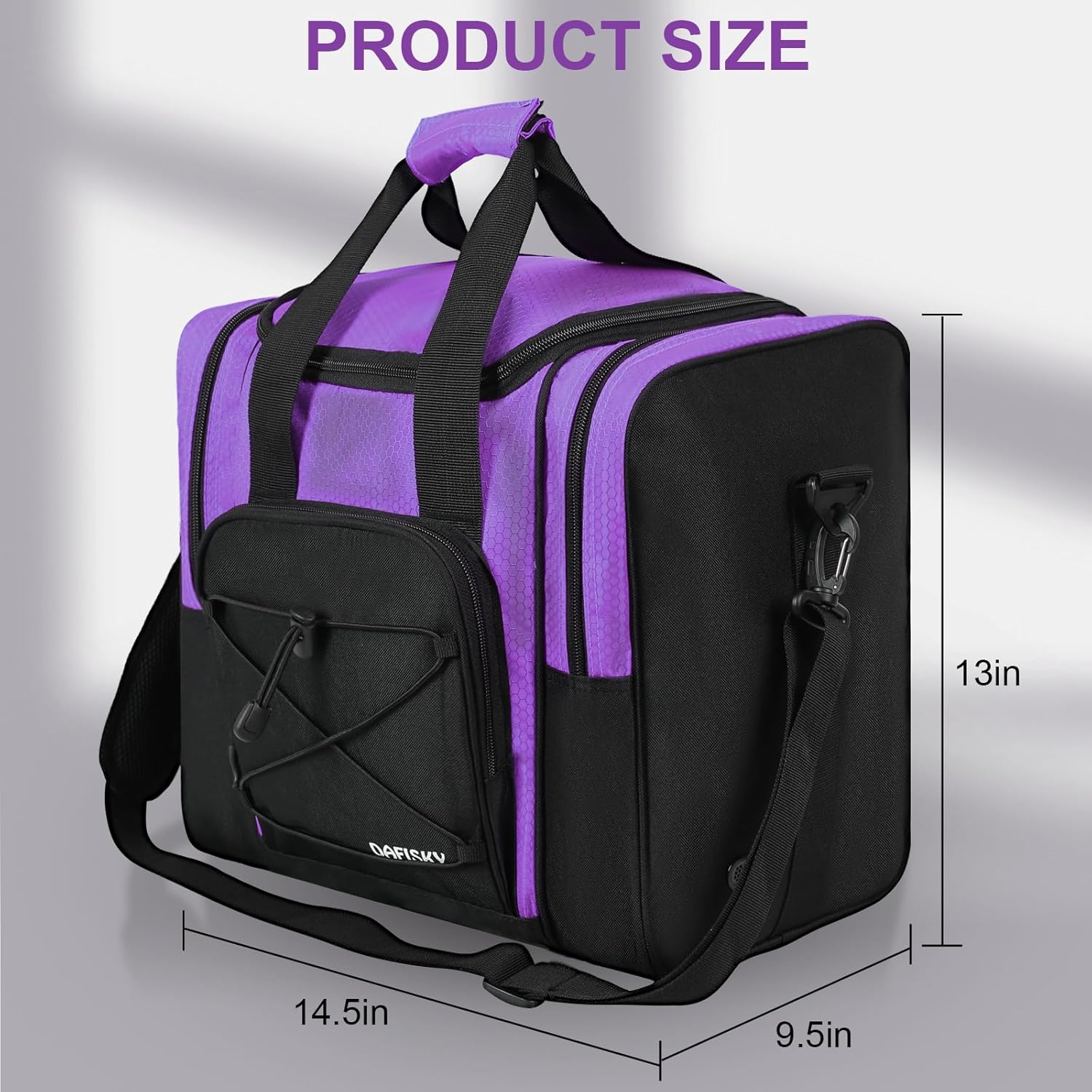 The DAFISKY Bowling Bag is built for travel and convenience while hauling all of your bowling gear. Comfortable, lightweight design fits to men and women. This bowling bag features multiple large compartments to allow you to organize your gear all in one place. The main bowling ball pocket features a removable & padded foam bowling ball holder with strong 3mm reinforced hard plastic bottom. Two outer pockets can each hold a pair of bowling shoes plus accessories. The front pocket can be used to store keys, wallet, cell phone, etc. The elastic cord can be used to hang small belongings. You will carry your bowling ball, shoes, socks, towel, bowling tape, wrist support, ball cleaner, etc. ALL IN ONE BAG This functional backpack is designed to organize, secure, and transport two bowling balls along with essential accessories. It focuses on protection for your equipment and comfort during carry. Organized & Accessible Storage The main compartment holds two bowling balls and men's shoes up to size 16, with ventilation holes to encourage airflow. Two front pockets and two side mesh pockets provide designated space for smaller items like gloves, towels, and water bottles, keeping gear neatly separated and readily available. Secure & Adjustable Ball Protection The base features a triple-hole padded design with two removable dividers, allowing you to configure the layout for one or two balls. High-density molded foam inserts cradle each ball to minimize movement. The included divider can be placed between balls to help protect surfaces. Comfortable Transportation An ergonomic carrying system includes a padded back panel and an adjustable chest strap. This design helps distribute the bag's weight across the back and shoulders for more manageable transport. Specifications Dimensions: 17" x 15" x 8" Capacity: 2 bowling balls + shoes Features: Removable dividers, foam inserts, ventilation holes, multiple pockets