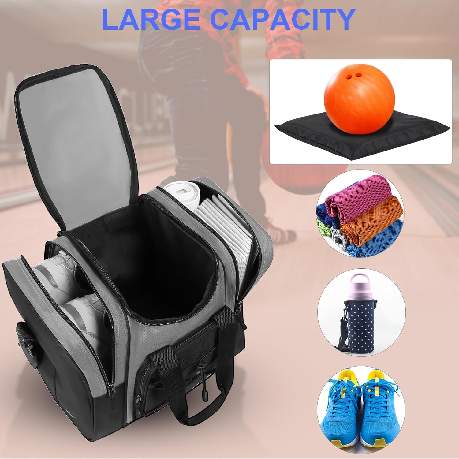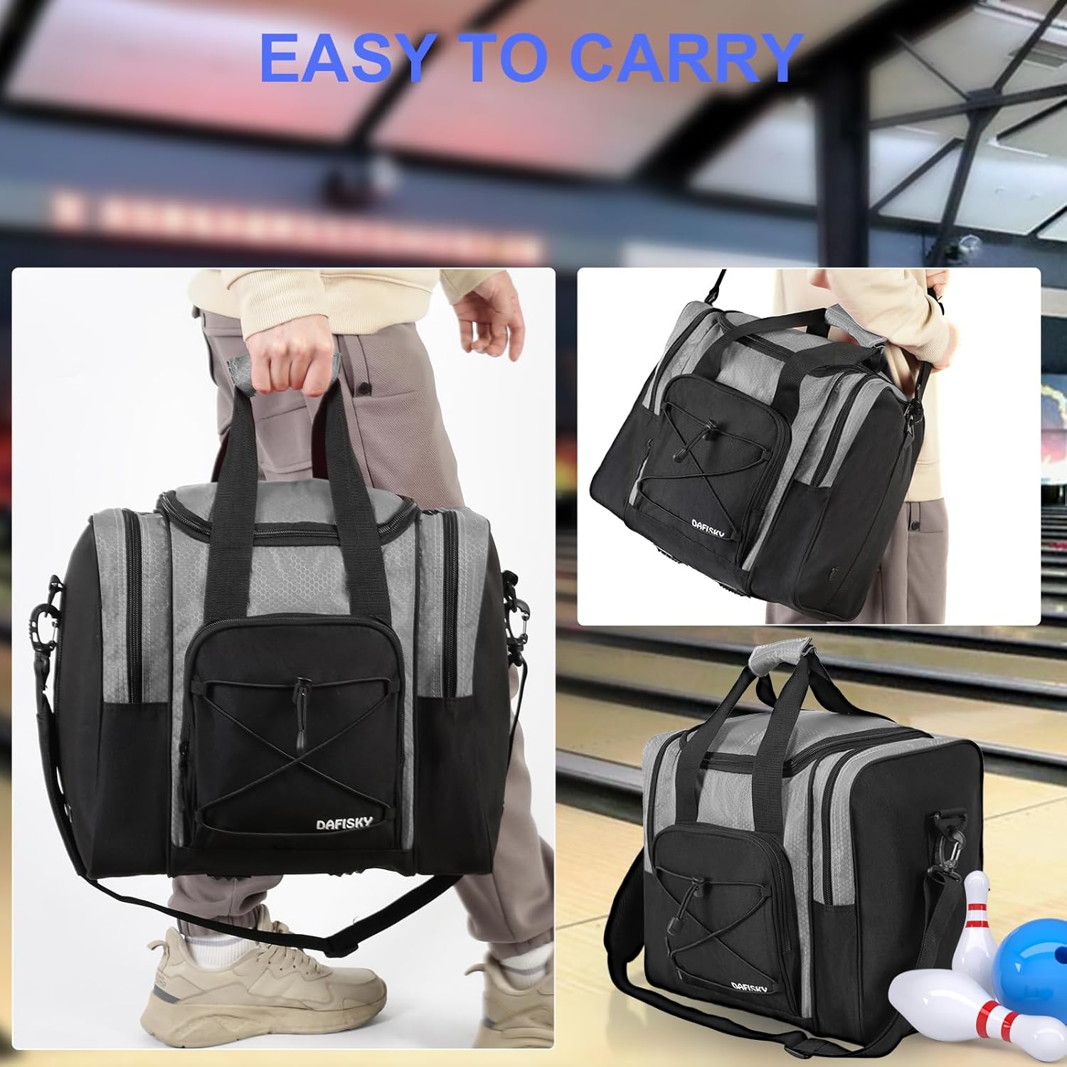 The DAFISKY Bowling Bag is built for travel and convenience while hauling all of your bowling gear. Comfortable, lightweight design fits to men and women. This bowling bag features multiple large compartments to allow you to organize your gear all in one place. The main bowling ball pocket features a removable & padded foam bowling ball holder with strong 3mm reinforced hard plastic bottom. Two outer pockets can each hold a pair of bowling shoes plus accessories. The front pocket can be used to store keys, wallet, cell phone, etc. The elastic cord can be used to hang small belongings. You will carry your bowling ball, shoes, socks, towel, bowling tape, wrist support, ball cleaner, etc. ALL IN ONE BAG This functional backpack is designed to organize, secure, and transport two bowling balls along with essential accessories. It focuses on protection for your equipment and comfort during carry. Organized & Accessible Storage The main compartment holds two bowling balls and men's shoes up to size 16, with ventilation holes to encourage airflow. Two front pockets and two side mesh pockets provide designated space for smaller items like gloves, towels, and water bottles, keeping gear neatly separated and readily available. Secure & Adjustable Ball Protection The base features a triple-hole padded design with two removable dividers, allowing you to configure the layout for one or two balls. High-density molded foam inserts cradle each ball to minimize movement. The included divider can be placed between balls to help protect surfaces. Comfortable Transportation An ergonomic carrying system includes a padded back panel and an adjustable chest strap. This design helps distribute the bag's weight across the back and shoulders for more manageable transport. Specifications Dimensions: 17" x 15" x 8" Capacity: 2 bowling balls + shoes Features: Removable dividers, foam inserts, ventilation holes, multiple pockets