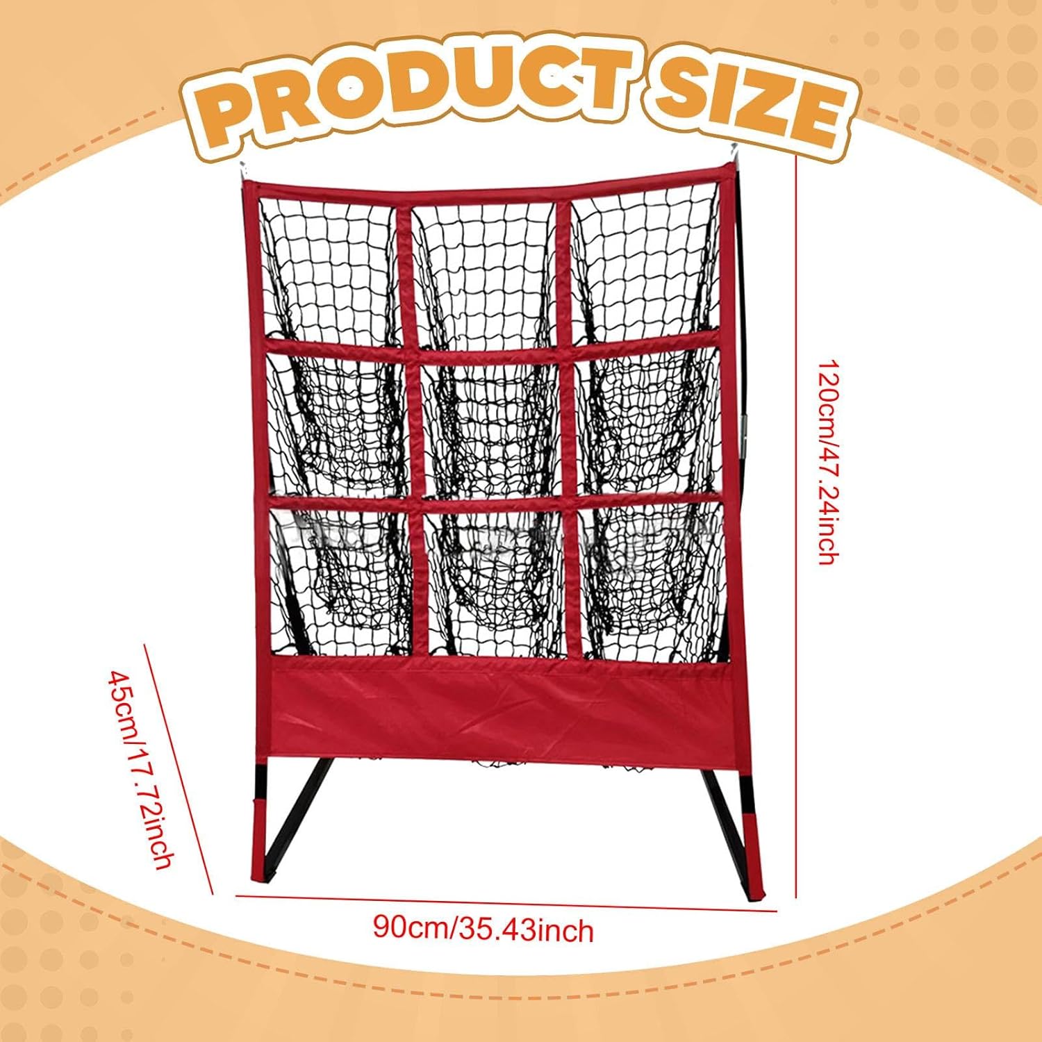 Description: - 【9 Hole】:Pitching Net Enhance your pitching and hitting skills with 9 separated pitching pockets, suitable for both baseballs and softball - 【Efficient】: Pitching Target Features an extra large target area to maximize hitting space and minimize ball chasing time, helping focus on improving their accuracy and skill. - 【Material】Softball Baseball Net is Constructed with a sturdy metal frame, polyester netting, and pp components to ensure long time performance through multiple seasons of rigorous training - 【Portable】Quick to set up on any surface and easy to store, practice your throwing , ideal for indoor training, beach entertainment, , activities - 【Suitable for All Skill Levels】: Whether you're a beginner or an experienced player, this is suitable for all skill levels, helping you improve your skills and boost performance on the fieldSize Chart:120cmx90cmx45cm/47.24inchx35.43inchx17.72inchNet Hole: 25cmx25cm/9.84inchx9.84inchPackage Includes:1 Baseballs Softball Pitching TargetNote:Please allow slightly errors 1-2cm/0.39-0.79inch differences due to manual measurement.