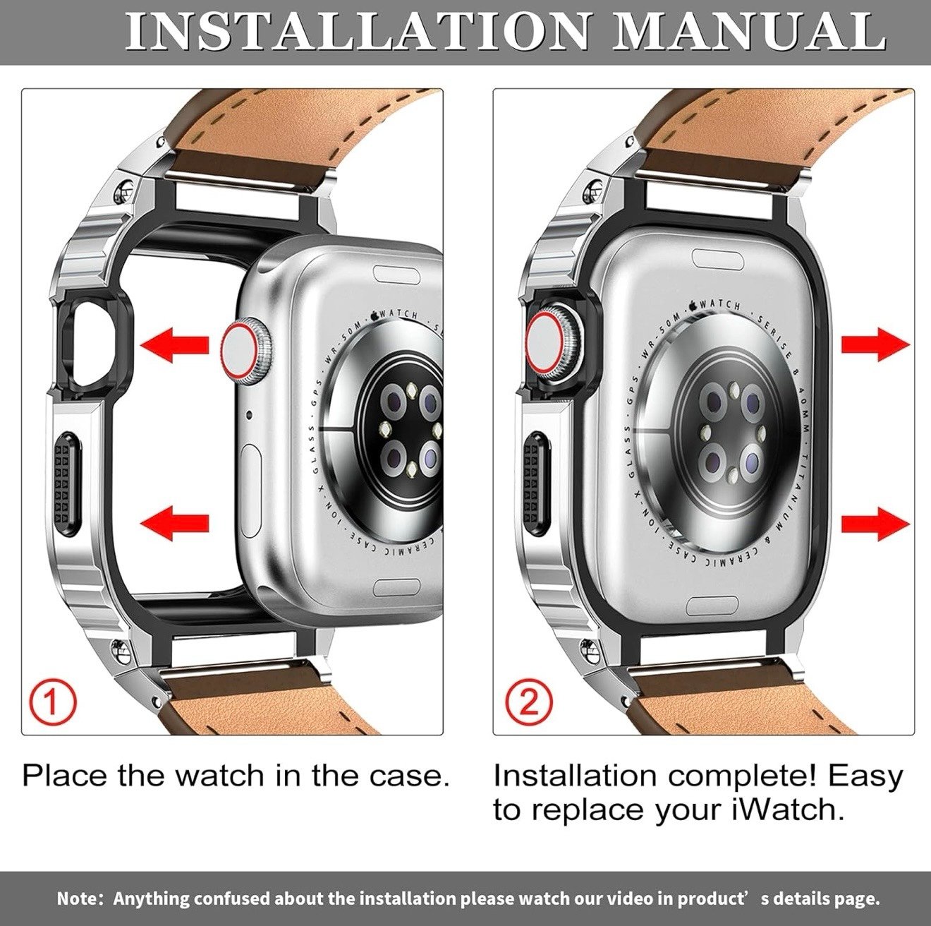 SUPLINK Leather Band with Stainless Steel Case for Apple Watch 44mm 42mm Size: 42/44mm (series SE 6/5/4/3/2/1), Rugged Bumper for Men