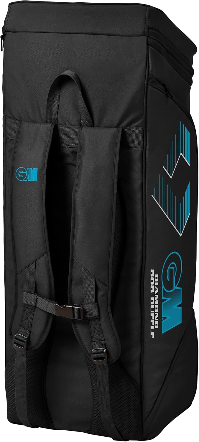 Gunn and Moore GM Cricket Duffle Bag Rucksack, Diamond 808 Duffle, Black, Extra Large - 114-123 Litres,600 Denier Polyester Fabric,2 x Integrated Bat Pockets,2 x Padded Adjustable Shoulder Straps,Shoe Tunnel, Zipped Side Pockets, Internal Bat Pouches,DVO activated: 98cm (back) x 98cm (front) x 33cm x 38cm/Volume 123 Litres.